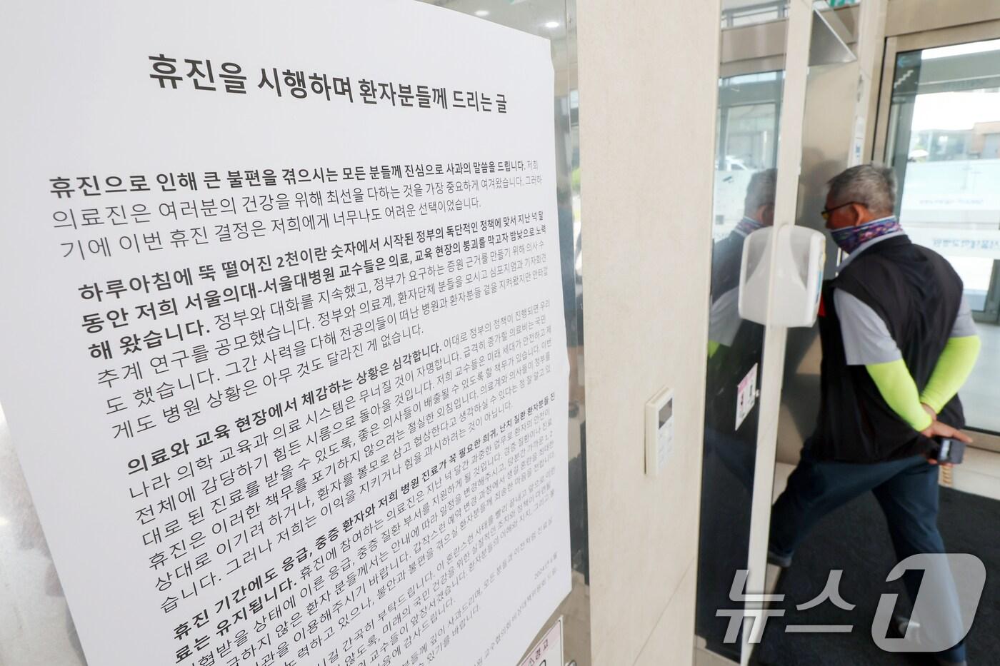 주요 대형병원의 무기한 휴진 움직임이 확산하면서 의료 공백 우려가 커지고 있는 20일 서울 종로구 서울대학교병원에 서울대병원 비대위 측의 휴진 안내문이 게시돼 있다. 2024.6.20/뉴스1 ⓒ News1 민경석 기자
