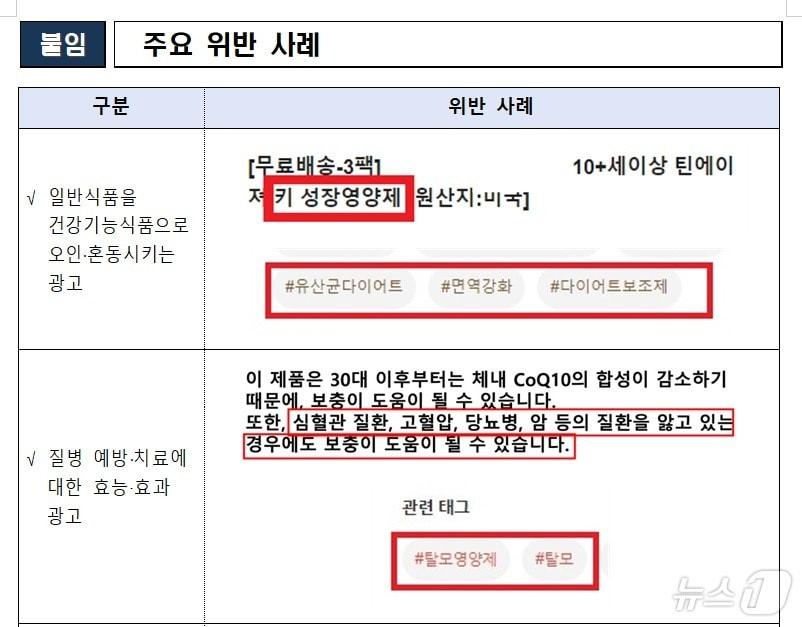 '키 성장영양제', '다이어트' 식품 등 건기식으로 광고주요 위반 사례(식품의약품안전처 제공)관련 키워드식품의약품안전처식약처건강기능식품불법부당광고강승지 기자 [100세건강] 한 해 마무리, 지금도 늦지 않은 금연…"좋은 선택"일부 청소년, 감기약-수면유도제 30알씩 복용…"건강 피해 우려"관련 기사휴온스엔, 이너뷰티 '허니 탱탱 젤리 스틱' 출시'암 예방하는 영양제'…오인·혼동 광고 280건 적발대상웰라이프, 어린도두꼬투리추출물로 첫 기능성원료 식약처 승인신약·바이오시밀러·신의료기기 허가기간 '세계 최단' 추진[보건복지 업무보고]AI로 가짜 의사·약사 만들어 의약품인 듯 광고…84억원 상당 팔아