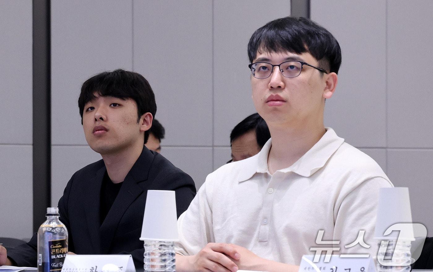 한성존 대한전공의협의회 비상대책위원장(오른쪽)과 이선우 대한의과대학·의학전문대학원학생협회 비대위원장이 13일 서울 용산구 대한의사협회 대강당에서 열린 제1회 전국의사 의료정책 심포지엄을 찾아 주제 발표를 경청하고 있다. 2025.7.13/뉴스1 ⓒ News1 박지혜 기자