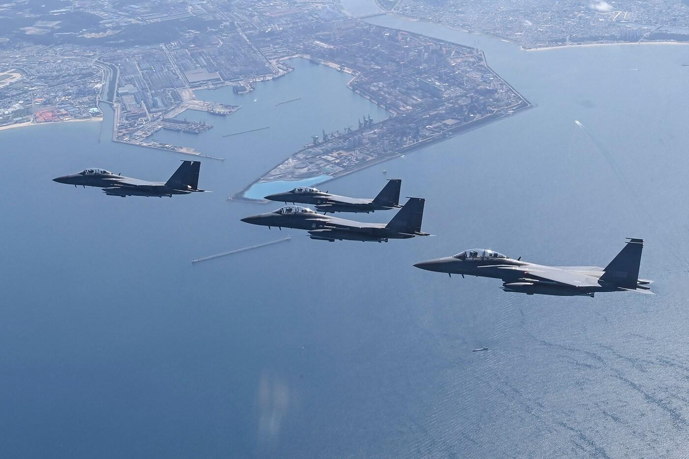 공군 F-15K 전투기 편대가 울산 온산공단 상공에서 초계비행하고 있다. (공군 제공)ⓒ 뉴스1공군 F-15K 전투기 편대가 부산 상공을 초계비행하고 있다. (공군 제공)ⓒ 뉴스1공군 F-15K 전투기 편대가 강원도 경포해안 상공을 비행하고 있다. (공군 제공)ⓒ 뉴스1관련 키워드6·25F-15K전투기국방부초계비행공군관련 기사공군총장, K-방산 이끌 KF-21 '쇼케이스' 나서…직접 타고 지휘비행北, 한미일 협력에 '핵전쟁' 운운…농업 생산 대변혁 주장도[데일리북한]6·25 전쟁 때 100회 넘게 비행한 90대 조종사, 현충일 시구 참석2000시간 무사고 비행…2024 공군 최우수 조종사에 조성민 소령北 위협 속 한미일 공중훈련…美 B-1B 전략폭격기 전개(종합2보)