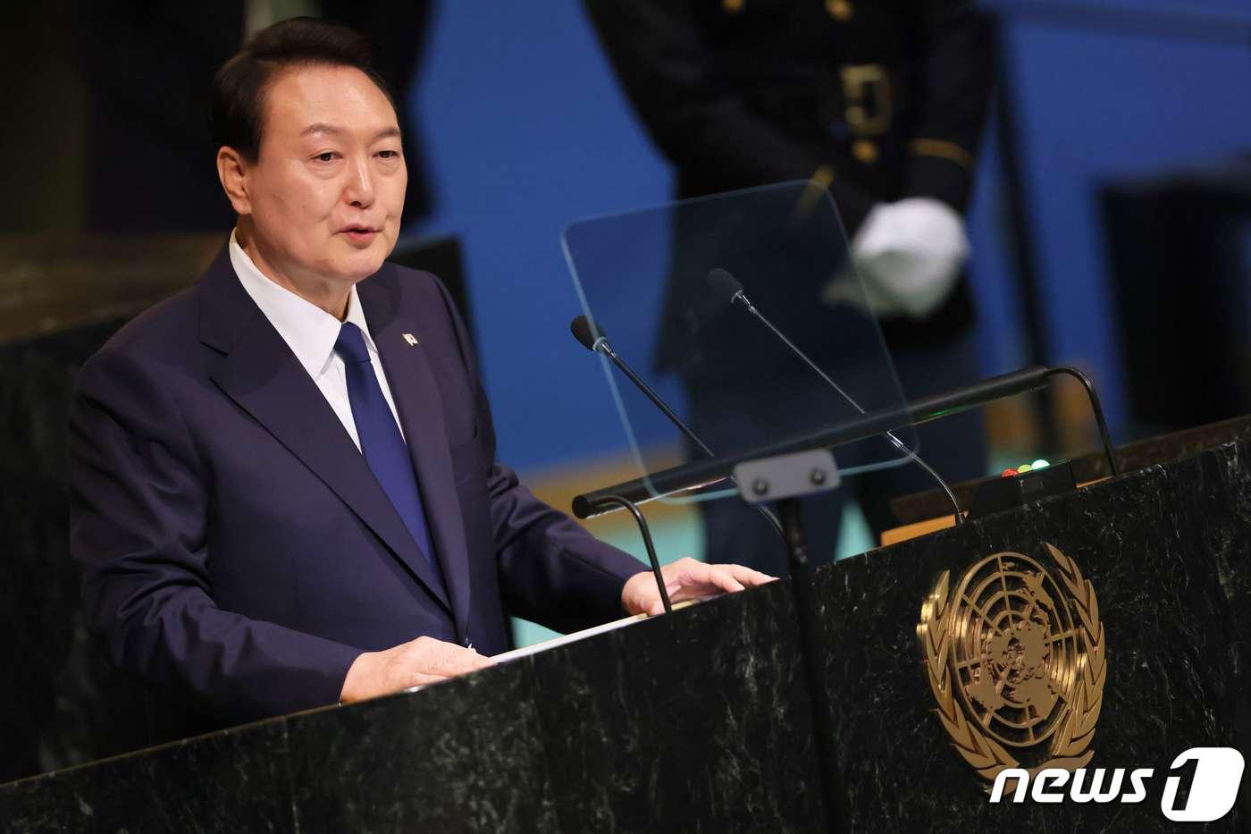 윤석열 대통령이 20일(현지시간) 미국 뉴욕 소재 유엔본부에서 제77차 유엔총회 고위급 일반토의 기조연설을 하고 있다. ⓒ AFP=뉴스1