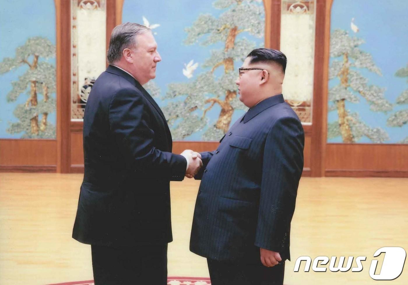 김정은 북한 국무위원장이 지난 2018년 부활절 주말기간(3월31일∼4월1일)에 평양을 극비 방문한 당시 CIA 국장인 마이크 폼페이오 전 미 국무장관과 악수를 하고 있는 모습. ⓒ AFP=뉴스1 ⓒ News1 우동명 기자