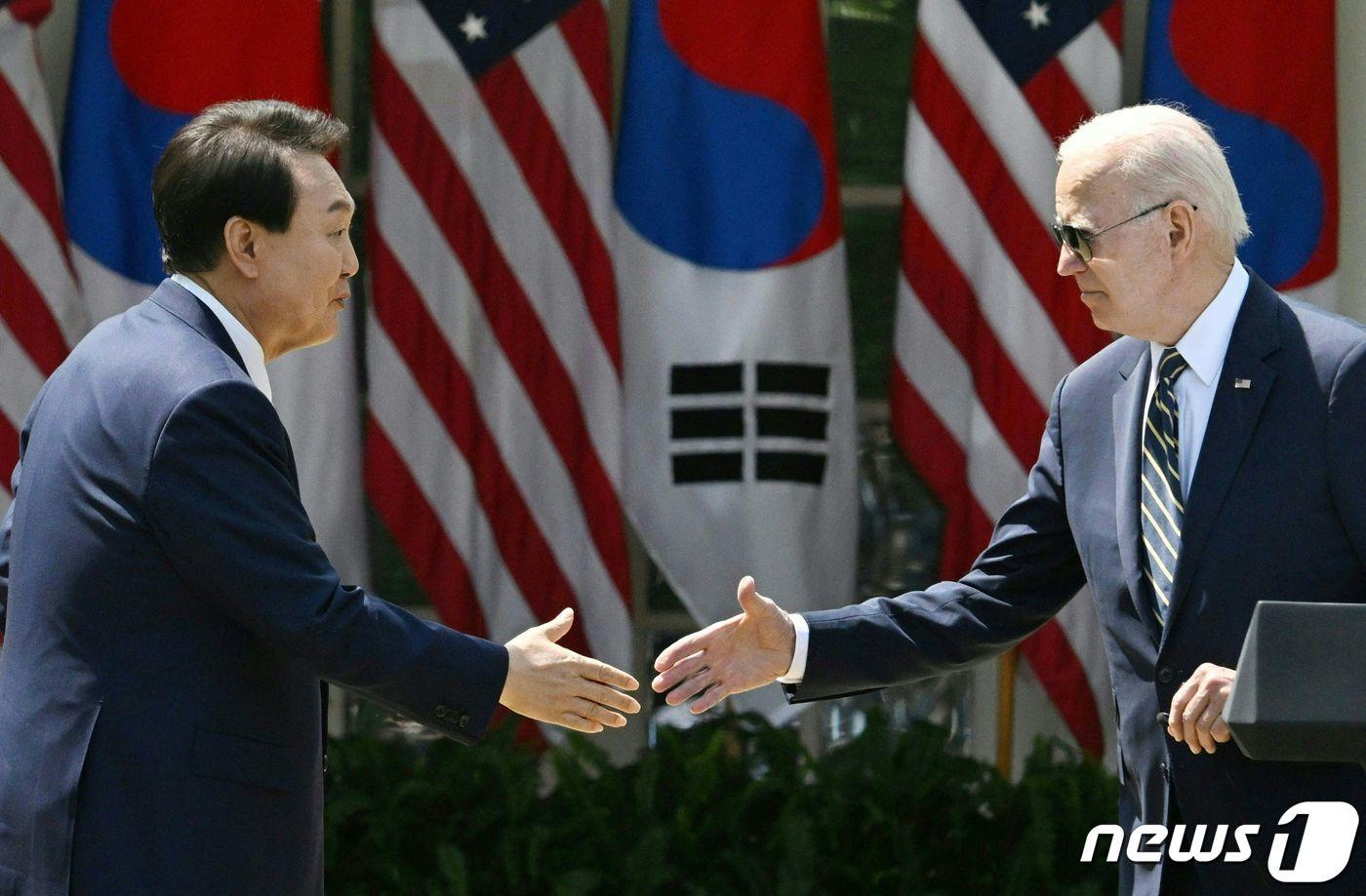 윤석열 대통령(왼쪽)과 조 바이든 미국 대통령이 26일(현지시간) 미 백악관 로즈가든에서 진행된 공동 회견에 참석, 악수하기 위해 손을 내밀고 있다. ⓒ AFP=뉴스1