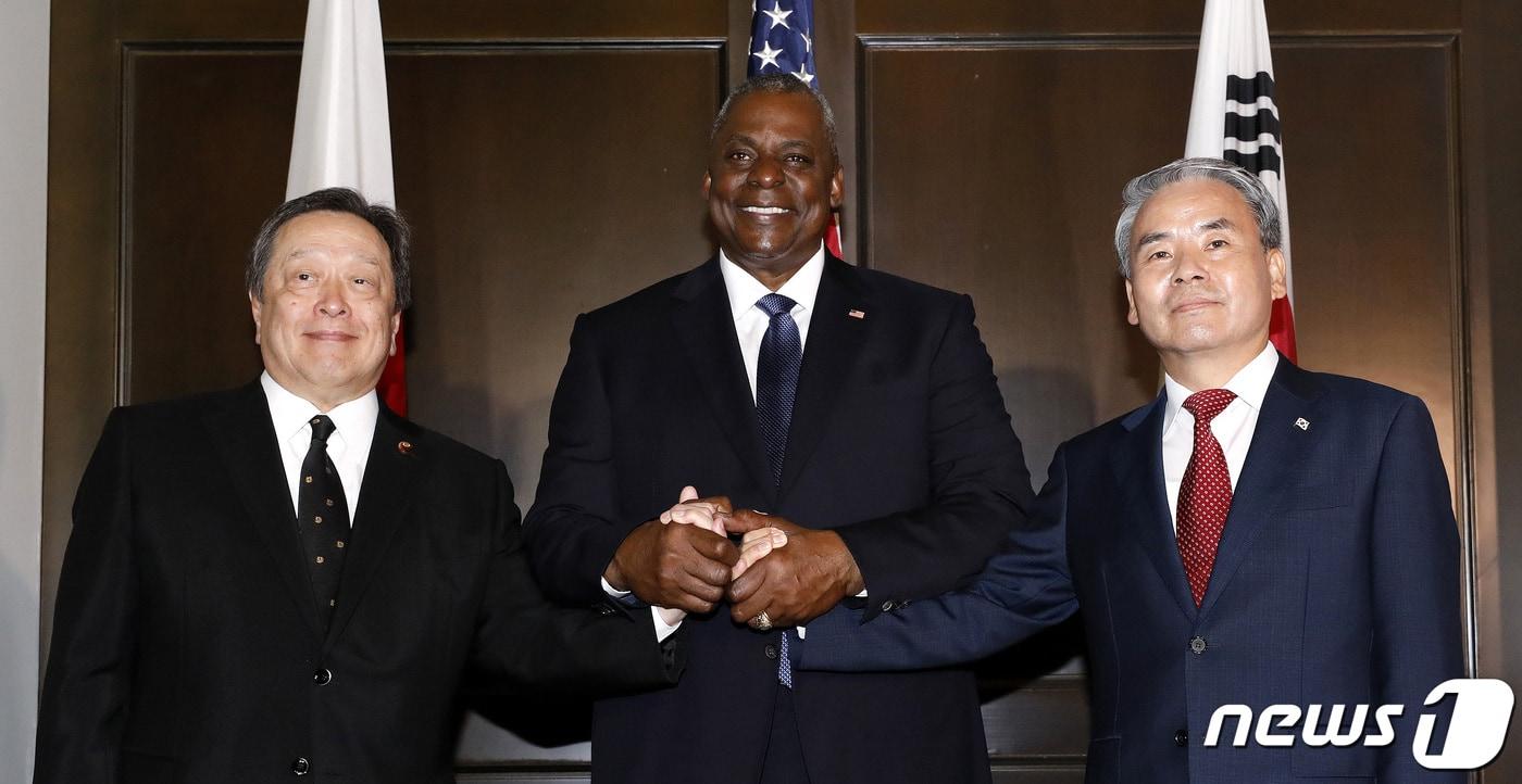아시아안보회의(샹그릴라 대화)에 참석 중인 이종섭 국방부 장관이 3일(현지시간) 싱가포르 샹그릴라 호텔에서 열린 한·미·일 국방장관회담에 앞서 로이드 오스틴 미국 국방부 장관, 하마다 야스카즈 일본 방위상과 기념촬영을 하고 있다. 왼쪽부터 하마다 야스카즈 일본 방위상, 로이드 오스틴 미국 국방장관, 이종섭 국방장관. 2023.6.3/뉴스1 ⓒ News1 박지혜 기자