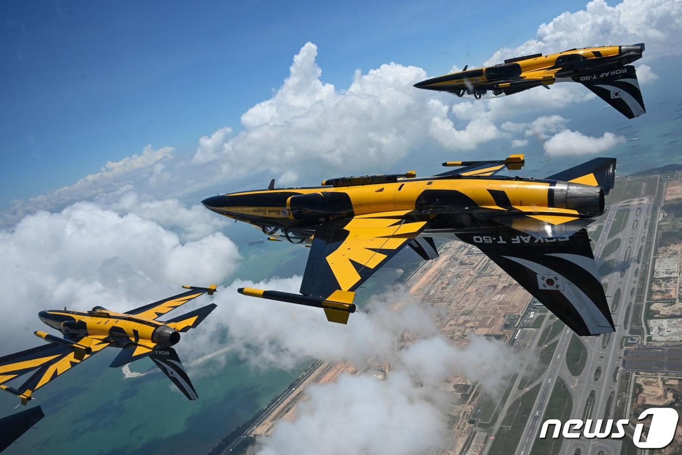 공군 특수비행팀 블랙이글스가 20일(현지시간) 열린 싱가포르 에어쇼 2024에서 구스 기동을 선보이고 있다. 공군은 오는 25일까지 열리는 이번 에어쇼에 예비기 1대를 포함해 T-50B 9대, 인원과 화물 수송을 위한 C-130 수송기 3대, 장병 110여 명을 파견했다. (공군 제공) 2024.2.20/뉴스1