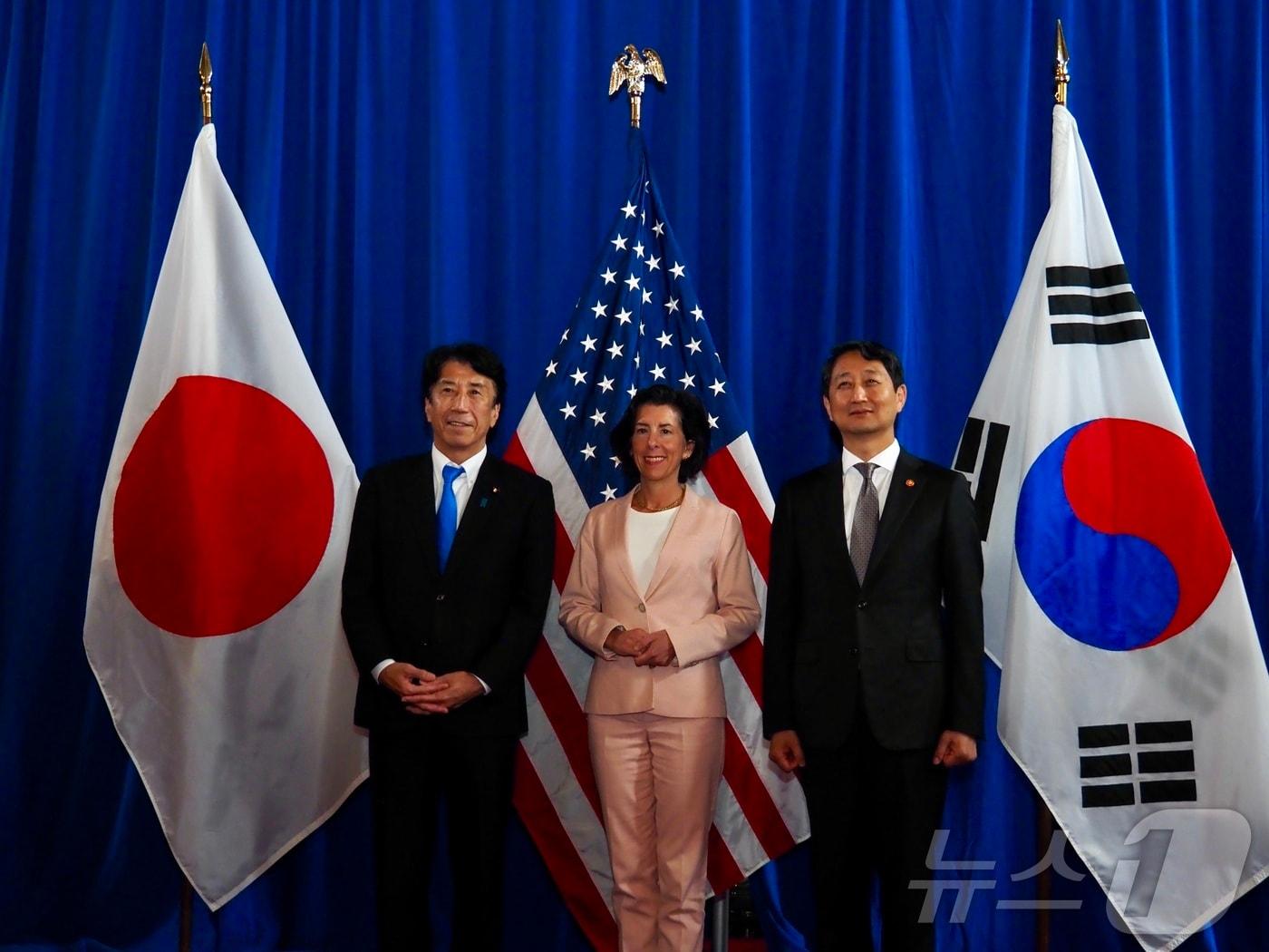 캠프 데이비드 정상회의 합의에 따라 첫 회의…"반도체·배터리 등 공급망 협력 최우선 과제""특정 공급원에 대한 경제적 의존 무기화 우려"…한미일 재계회의도 발족안덕근 산업통상자원부 장관(오른쪽)과 지나 러몬도 미 상무장관(가운데), 사이토 켄 일본 경제산업상(왼쪽)은 이날 워싱턴DC 미 상무부에서 첫 3국 산업장관 회의를 갖고 있다. 사진은 회의 전 기념촬영을 하고 있는 모습. 워싱턴특파원단 제공. 2024.6.26.한미일 3국 산업장관이 26일(현지시간) 워싱턴DC 미 상무부에서 첫 회의를 갖고 있다. 사진은 워싱턴특파원단 제공.관련 키워드한미일안덕근김현 기자 케냐 찾은 韓 중학생들 "다름을 이해하고 함께 사는 법 배웠어요"정기국회 개원식·中전승절 김정은 참석…이번주(1~5일) 일정관련 기사김정관, 역대 장관들과 간담회…복합위기 극복 위한 '3대 산업 전략' 논의트럼프 '깜짝 청구서' 없었지만…3500억불 펀드·농산물 '잔불' 여전한미 협상 막판 지렛대는 'K-조선'…'현지화 협력' 韓 협력안 제시구윤철·여한구, 25일 미국과 '2+2 관세 담판'…산업·외교장관도 함께(종합)李정부, 경제·통상 투톱 출격…D-12 한미 관세협상 '총력전'