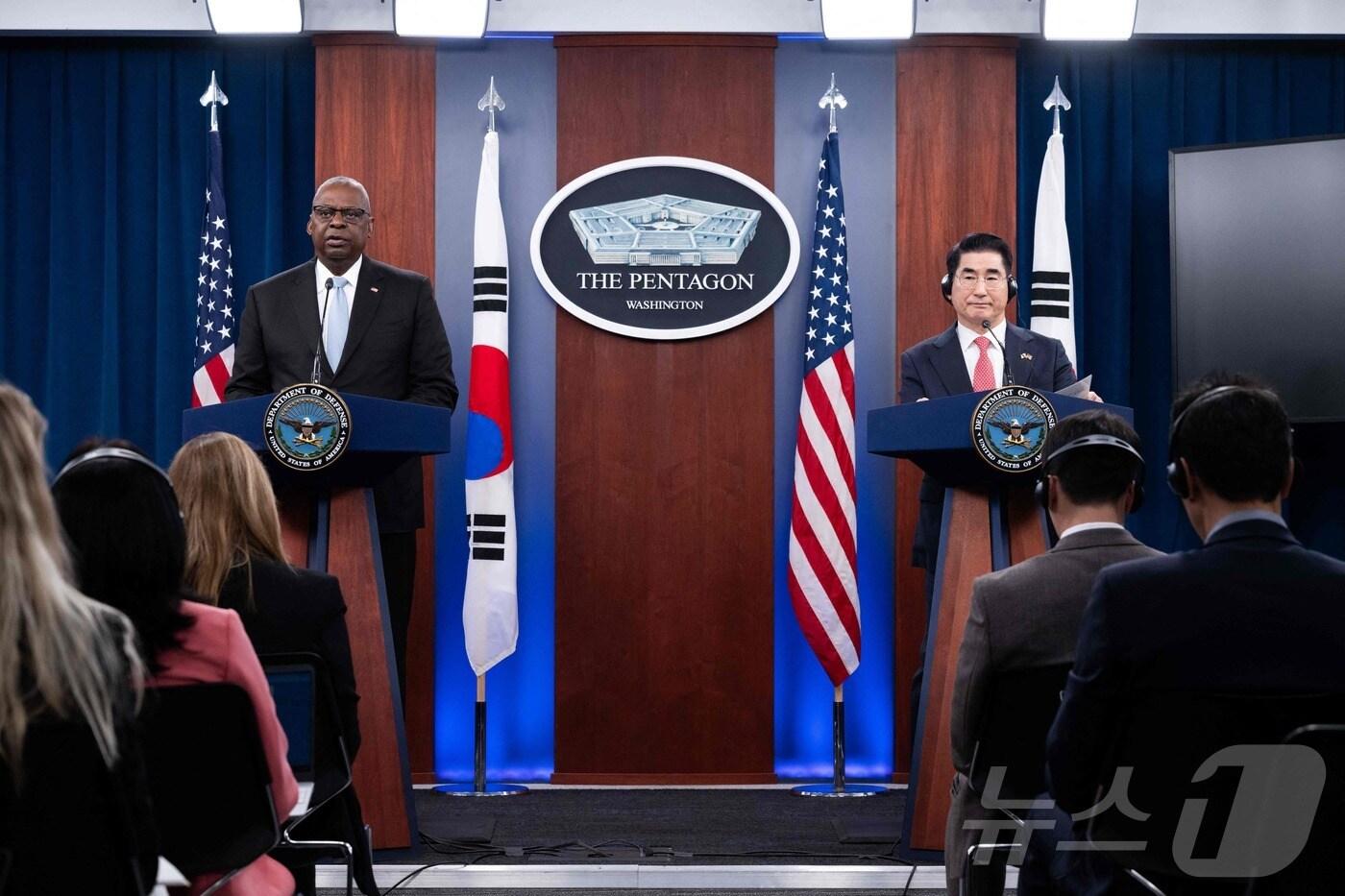 김용현 국방부 장관과 로이드 오스틴 미국 국방장관이 30일(현지시간) 워싱턴DC 펜타곤에서 제56차 한미안보협의회(SCM)를 갖고 공동성명을 발표하고 있다.<자료사진> ⓒ AFP=뉴스1