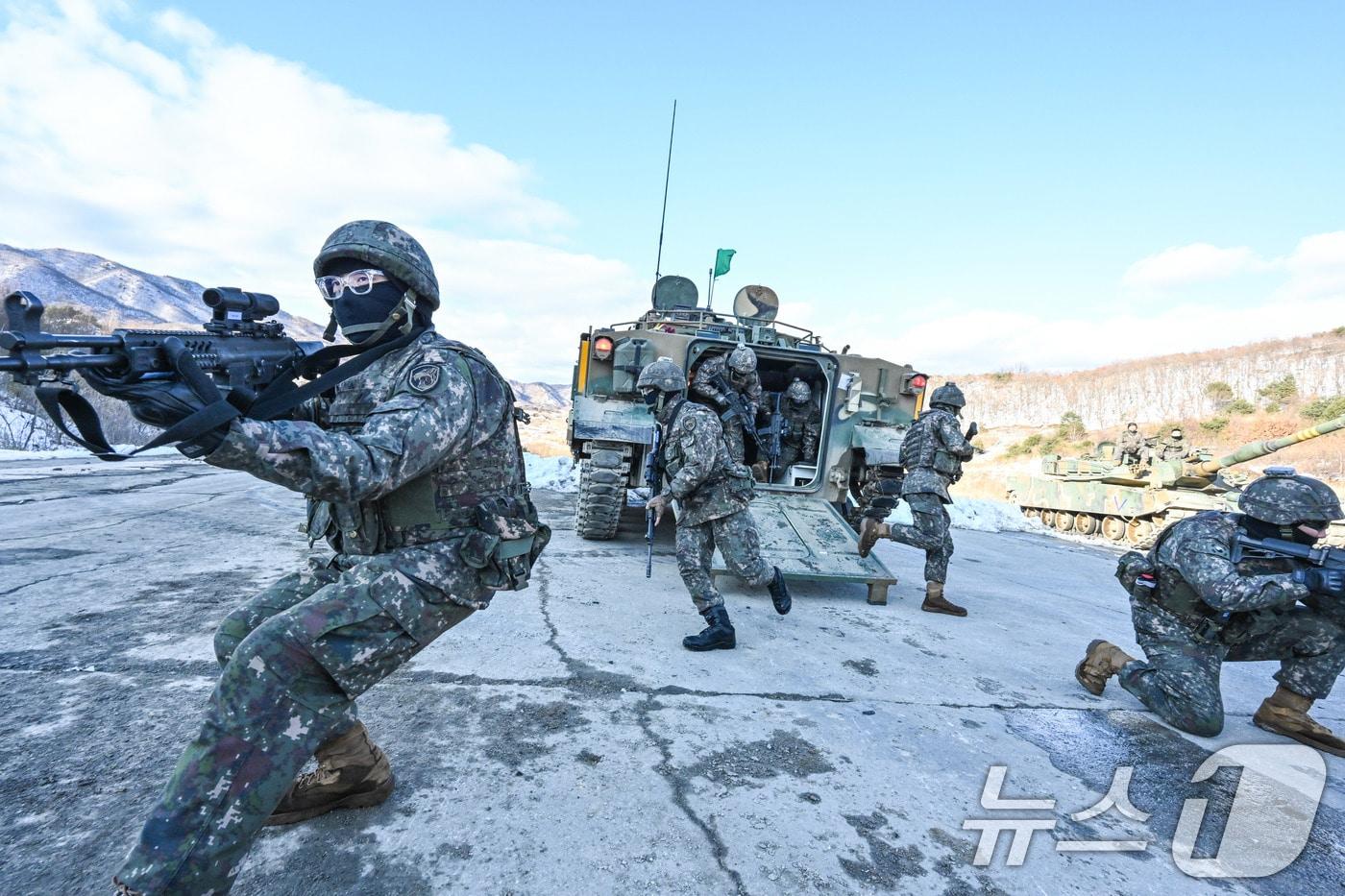 육군 수도기계화보병사단 전차대대TF 장병들이 6일 경기도 포천시 승진과학화훈련장에서 열린 올해 첫 '한미 연합합동 통합화력 실사격 훈련'에서 장갑차에서 하차해 목표고지를 점령하고 있다. (육군 제공. 재판매 및 DB 금지) 2025.3.6/뉴스1