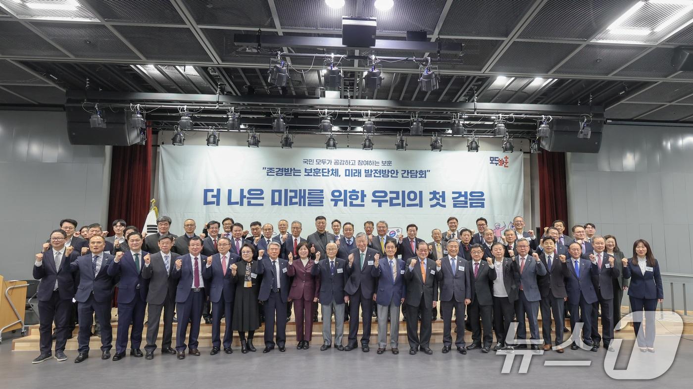 강정애 국가보훈부 장관이 지난 11일 서울 서대문구 국립대한민국임시정부기념관에서 열린 '존경받는 보훈단체, 미래 발전방안 간담회'에 참석하여 이종찬 광복회장, 유을상 대한민국상이군경회장 등 17개 보훈단체장과 보훈부 실.국장, 보훈부 정책자문위원회, 2030 자문단등과 함께 기념촬영을 하고 있다. (국가보훈부 제공. 재판매 및 DB금지) 2025.3.12/뉴스1