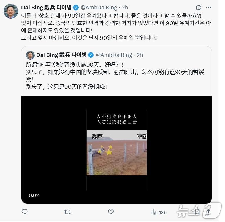 "공격을 받으면 반드시 반격"…미중 관세 전쟁 여론전 다이빙 주한 중국 대사 트위터 갈무리. 관련 키워드다이빙상호관세정윤영 기자 日 아소 다로 "한국 핵잠 도입, 안보의 새로운 본보기""한국인 50여명 이란 체류, 신속히 출국해달라"…외교부 긴급 권고관련 기사다이빙 中대사 "시진핑 방한으로 한중 새 국면…'외부 간섭' 함께 저항해야"벌써 시험대 오른 '균형 외교'…미중과 '첫 통화'에 촉각다이빙 "中 이익 희생되는 美와의 교역 체결 반대"[황재호가 만난 중국]트럼프는 관세 변죽…시진핑은 반미 연대 본격화 행보
