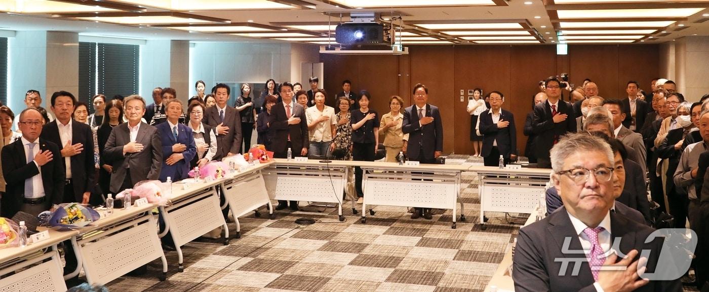 20일 일본 오사카시 주오구에 위치한 주오사카 대한민국 총영사관 5층 강당에서 '주오사카 대한민국 총영사관 건설기성회' 유족과 동포단체 관계자가 참석한 가운데 공관기증에 대한 감사장 전달 행사가 진행됐다. 이날 행사에는 기성회 유족과 동포단체 관계자 등 90여 명이 참석했다. 사진은 참석자들이 국기에 대한 경례를 하고 있다.2025.06.20/뉴스1 ⓒNews1 노민호 기자