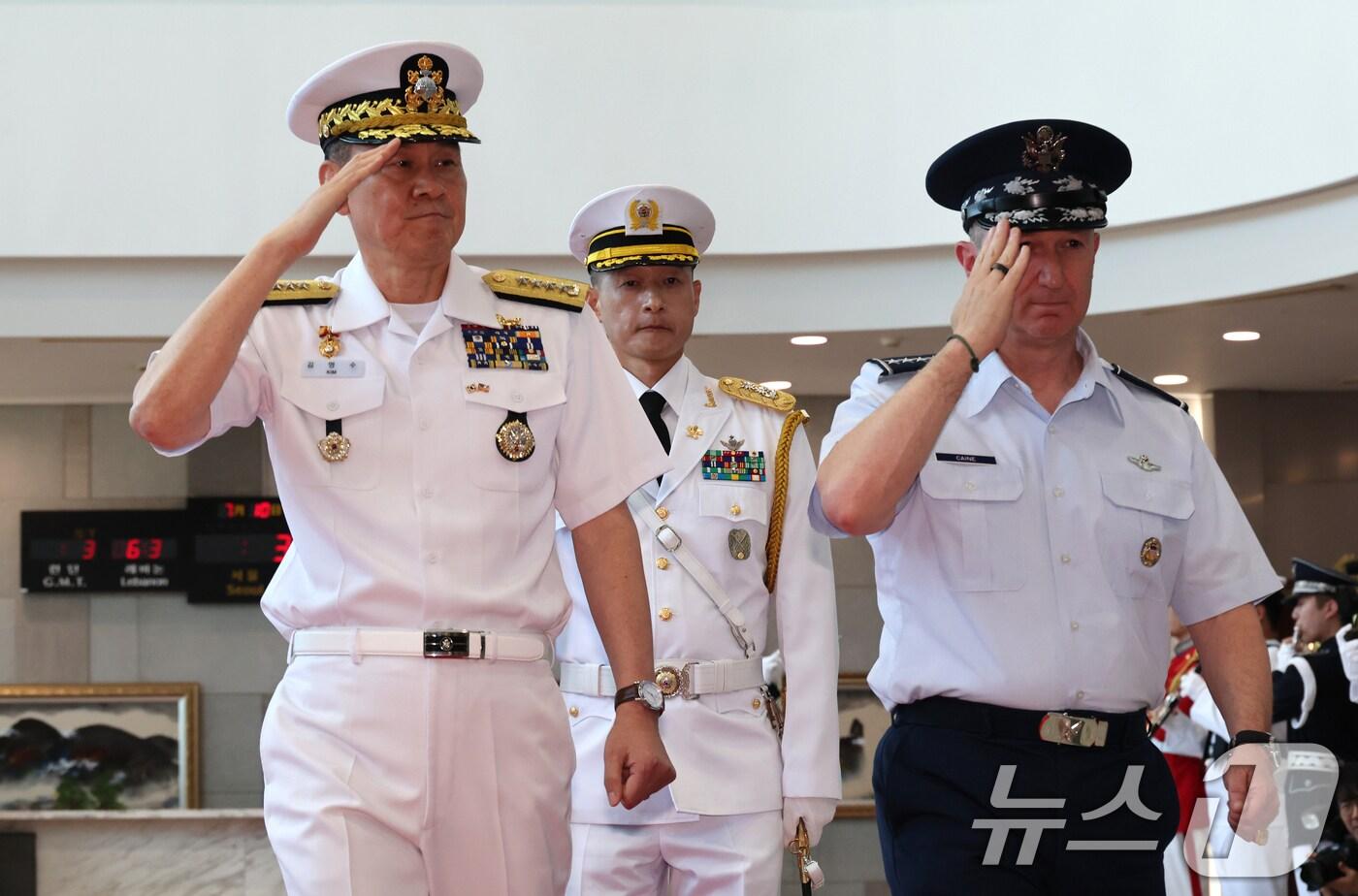 김명수 합동참모본부 의장과 요시다 요시히데 일본 통합막료장이 10일 오전 서울 용산구 국방부 연병장에서 열린 일본 통합막료장 의장행사에서 사열을 받고 있다. 2025.7.10/뉴스1 ⓒ News1 황기선 기자관련 키워드합참의장한미일한국미국일본합동참모본부트라이차드북한김예원 기자 해병대 1·2사단 작전권, 50년 만에 '원복'…해병작전사 창설 검토(종합)해병대 1·2사단 평시 작전권, 50년 만에 '원대 복귀'…작전사 창설도 검토관련 기사"전작권 전환 후 혼선 대비해 합동군사령부 창설 서둘러야"케빈 김 "주한미군, 한국에 대한 안보 제공 약속…주둔 계속 유지"北에게 한미연합훈련이 정말 '가장 예민한 사안'일까합참의장, 한미 연합 도하훈련 참관…"압도적 능력 갖춰야"제57차 한미안보협의회의(SCM) 공동성명…"내년에 FOC 검증"[전문]