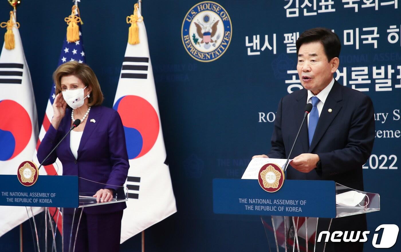 김진표 국회의장이 지난 4일 국회 본청에서 열린 낸시 펠로시 미국 하원의장과 공동언론발표에서 발표문을 낭독하고 있다. (공동취재) 2022.8.4/뉴스1 ⓒ News1 허경 기자