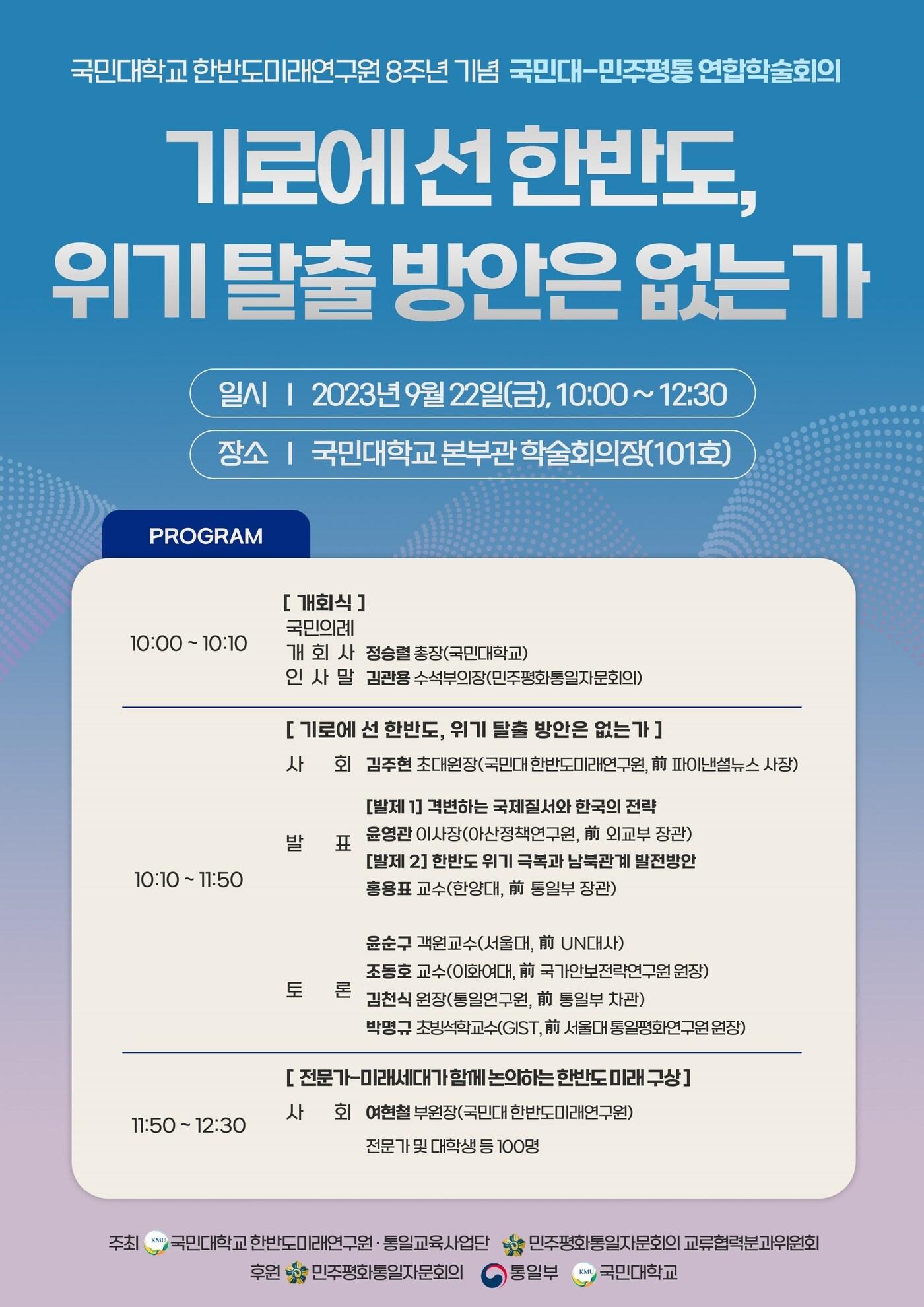 윤영관 전 외교장관, 홍용표 전 통일장관 발제 맡아"한미일 vs 북중러 대결구도 속 통일외교 방안 모색"국민대-민주평통 연합 학술회의 '기로에 선 한반도, 위기 탈출 방안은 없는가' 포스터.(국민대 제공)관련 키워드통일국민대민주평통구교운 기자 복지부 산하기관 업무보고…"국민이 일상서 체감하는 성과"연세대 의대 "유전체 입체구조, 면역 유전자 작동 여부에 영향"