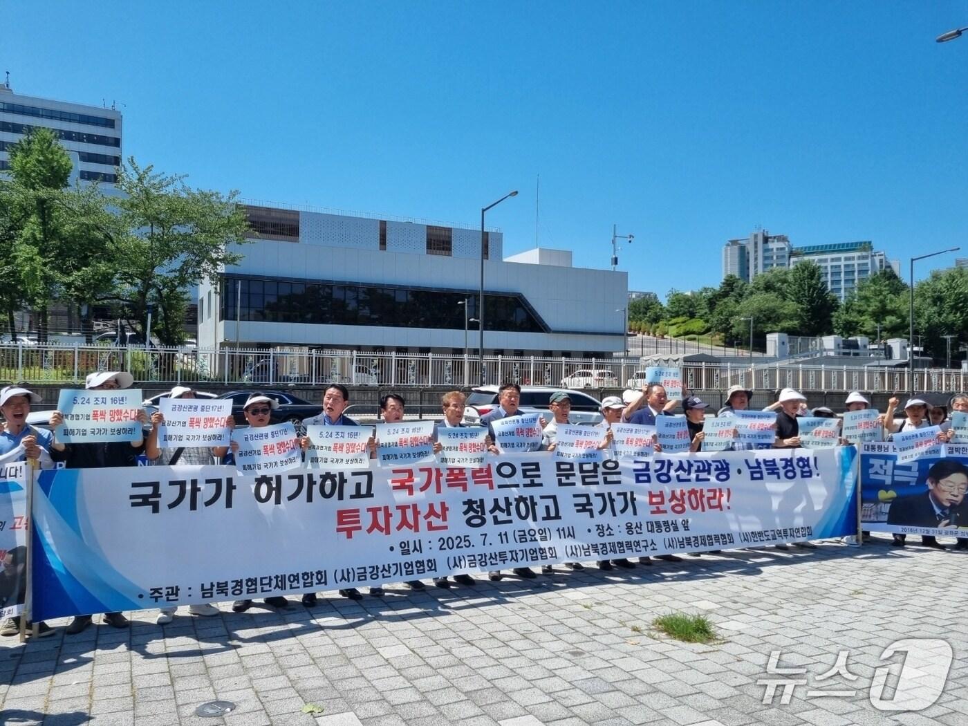 "이재명 대통령, 성남시장 시절 우리 주장에 공감 표해"통일부 "어려움엔 공감하지만 피해 지원은 신중 검토 필요"남북경협단체연합회는 11일 오전 대통령실 앞에서 기자회견을 열고 '남북경협기업 피해보상 특별법'을 제정해 "기업파산, 가족해체, 신용불량 등 지난 17년간 희망 고문당해 온 금강산 기업인과 남북경협기업인에게 실질적인 보상을 해달라"고 촉구했다. 2025.7.11/뉴스1 ⓒ News1 김예슬 기자관련 키워드금강산북한남북경협통일부김예슬 기자 김정은, 연일 군사 행보…"초강력 무기체계" 방사포 공장 시찰北 김정은, 용강군 병원·공장 준공식 참석…"올해 계획 성과적 완결"관련 기사금강산관광 투자기업들, 자산 '전액보상' 촉구…통일부 장관 면담 요청도정동영, 경협·교역·금강산 기업인에 "심적·물적 피해 진심으로 송구"정부, 北 금강산 철거 동향에 "남북 대화로 해결해야"남북 관계 볕드나…'확성기 공방' 중단에 경협주 강세[핫종목]5·24조치 15주년…남북 경협인들, 차기 정부에 "피해 보상 간곡히 청원"