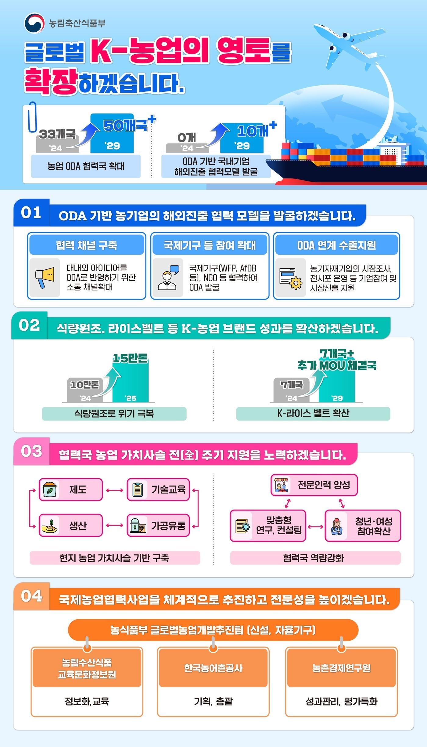 협력국 자립 기반 지원·기업 참여 활성화국제농업협력종합계획(농림축산식품부 제공) 2025.02.11 /뉴스1관련 키워드농림축산식품부ODA국제협력김승준 기자 농진청, 2월 2일까지 2026년 R&D 공모 진행…595억 규모농어촌 셀프 LPG 충전소 설치 가능해진다…규제샌드박스 32건 승인관련 기사국제농업협력도 '생산지원→실용·성과' 중심…ODA 민관협력 심포지엄정부, '국제개발협력의 날' 맞아 28일까지 '개발협력주간' 운영"원조 '받던' 나라가 '주는' 나라로"…한국 식량 역사 전시로 만난다韓 쌀 15만톤, 17개국에 원조…농식품부 "원조 넘어 식량위기 해소"정부, 내년 지출 27조 구조조정…ODA 예산 1조1000억 감액
