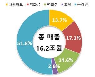 주요 유통업체 총 매출 16조 2000억2025년 1월 주요 유통업체 업태별 매출구성비 (산업통상자원부 제공) 2025.02.25 /뉴스1관련 키워드산업통상자원부유통휴일김승준 기자 통상본부장 "美 반도체 관세, 단기 영향 제한적…美에 쿠팡 문제 설득"노동부, 쿠팡 본사·계열사 근로감독 착수…불법파견 의혹 조사관련 기사온라인 '질주' 5월 유통매출 7%↑…오프라인도 4개월만에 증가"이분법적 갈등조장 경계"…유통 규제에 소상공인도 '온도차''13년 박힌 못' 유통산업발전법…"새 정부가 뽑아야"'유명무실' 족쇄에 갇힌 홈플러스…마트는 '휘청' 국회는 '쿨쿨'