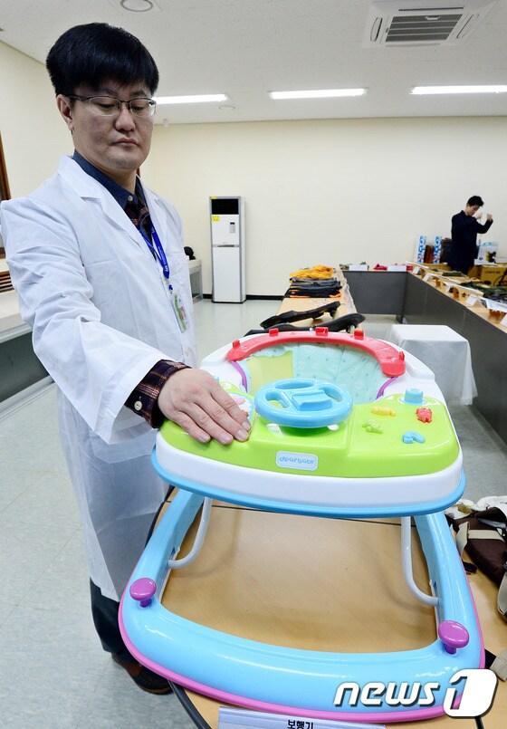 유아 어린이 제품 549종 안전성 조사결과유아용품, 아동복에 유해물질..스케이트보드, 레이저 제품은 안전 위험24일 오전 경기도 과천 한국화학융합시험연구원에서 열린 안전성 조사 결과발표 및 리콜제품 전시 설명회에서 연구원이 납 기준치의 2.51배를 초과한 보행기를 설명하고 있다. 2015.11.24/뉴스1 ⓒ News1 박세연 기자리콜대상 유아용 제품 ⓒ News1