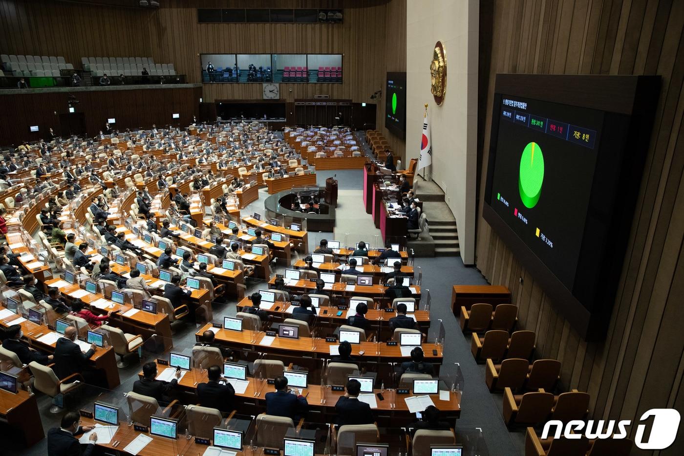 8일 서울 여의도 국회에서 열린 제400회 국회(정기회) 제14차 본회의에서 행정기본법 일부개정법률안이 찬성 241인, 반대 1인 기권 8인으로 가결되고 있다. 2022.12.8/뉴스1 ⓒ News1 이재명 기자