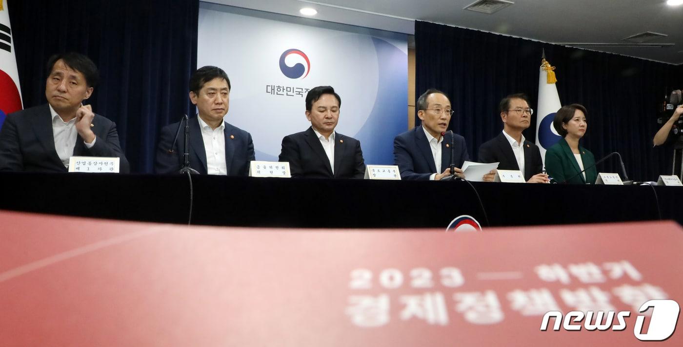 추경호 경제부총리 겸 기획재정부 장관과 관계부처 장차관들이 4일 오후 서울 종로구 세종대로 정부서울청사에서 2023년 하반기 경제정책방향 관계부처 합동 브리핑을 하고 있다. 왼쪽부터 장영진 산업부 1차관, 김주현 금융위원장, 원희룡 국토교통부 장관, 추 부총리, 이정식 고용노동부 장관, 이영 중소벤처기업부 장관. 2023.7.4/뉴스1 ⓒ News1 김명섭 기자