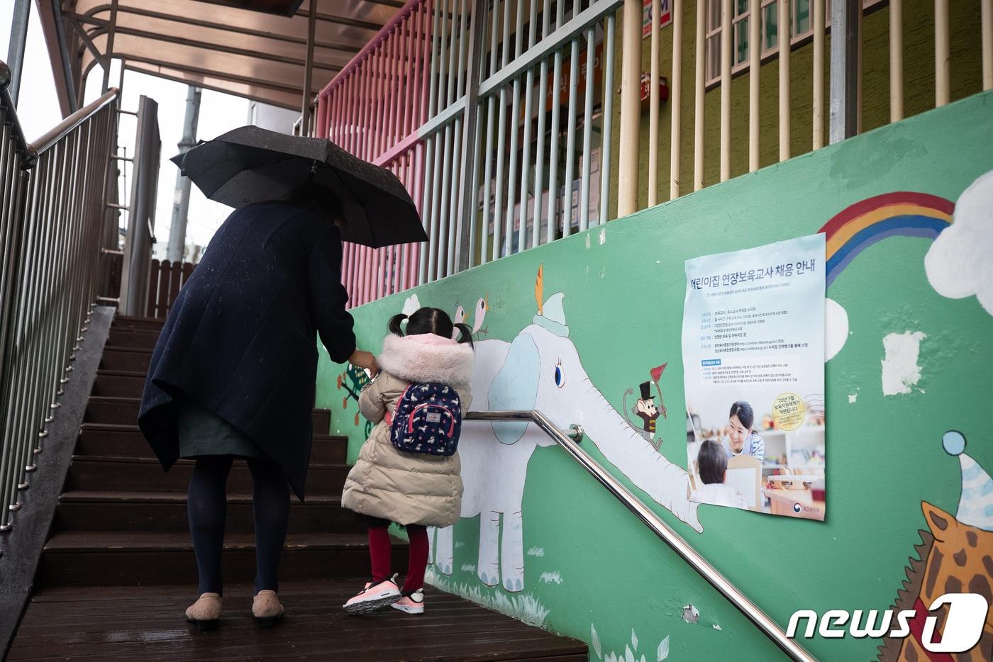 서울시내 한 국공립 어린이집에서 한 학부모가 자녀를 등원시키고 있다. 2020.2.25/뉴스1 ⓒ News1 유승관 기자
