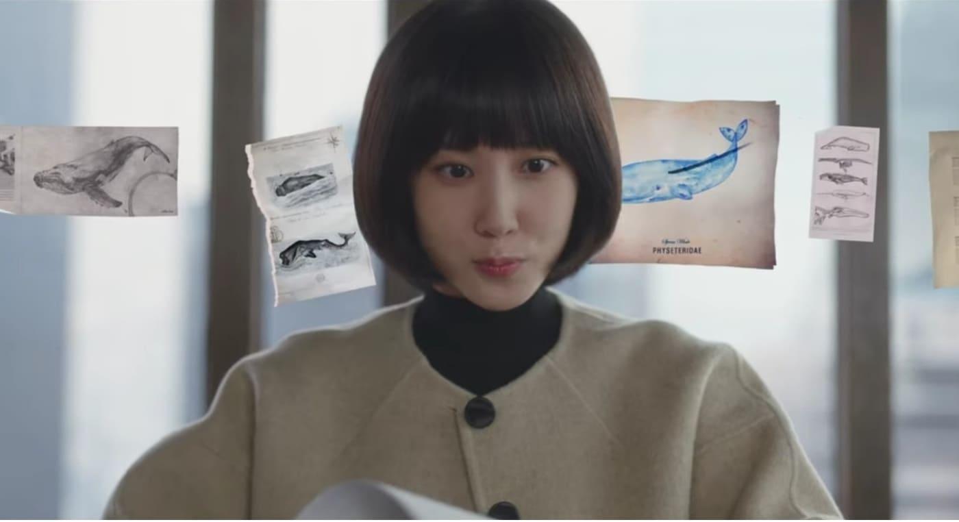 우영우(사진 위)는 직속 상사(사진 아래 오른쪽)와 사건에 대해 대화하던 도중 자신이 좋아하는 향고래에 대해 "소설 모비딕에 나오는 고래가 향고래다. 소설에서 향고래는 백경으로 묘사되지만 실제 향고래 몸은 어두운 회색이나 보랏빛을 띠는 갈색"이라면서 수도꼭지를 튼 것처럼 좔좔 말하다가 직속 상사로부터 "사건 집중 안하냐!"는 핀잔을 듣고 뚝 멈춘다. (사진= ENA 드라마 '이상한 변호사 우영우' 캡처) ⓒ 뉴스1