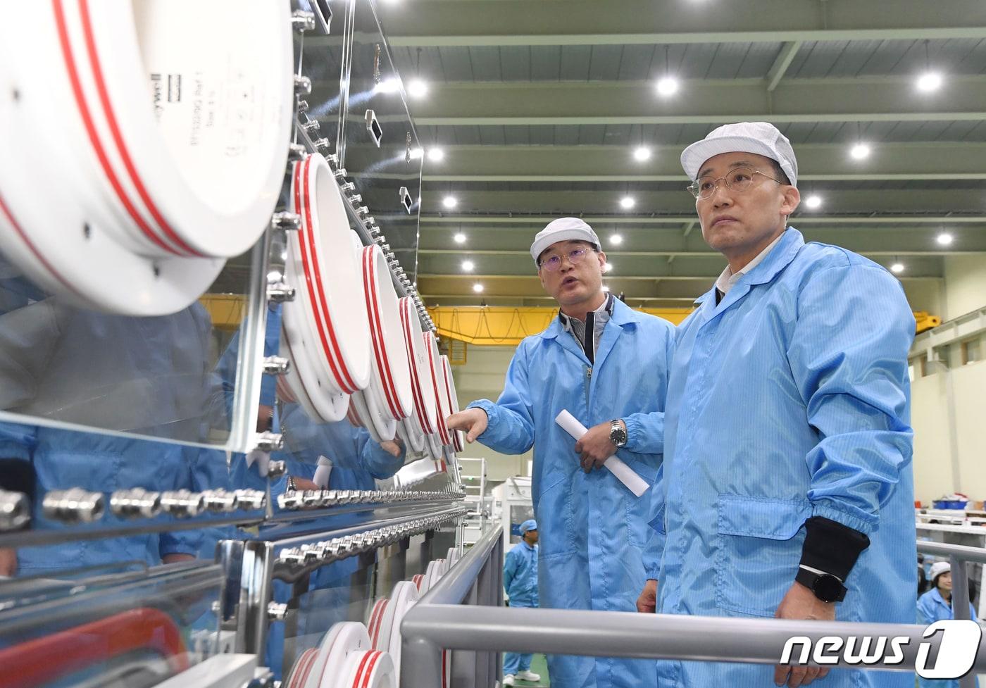 추경호 경제부총리 겸 기획재정부 장관이 3일 오전 서울 금천구 소재 수출 중소기업 (주)고려기연을 방문해 생산 시설을 둘러보고 있다. (기획재정부 제공) 2023.10.3/뉴스1