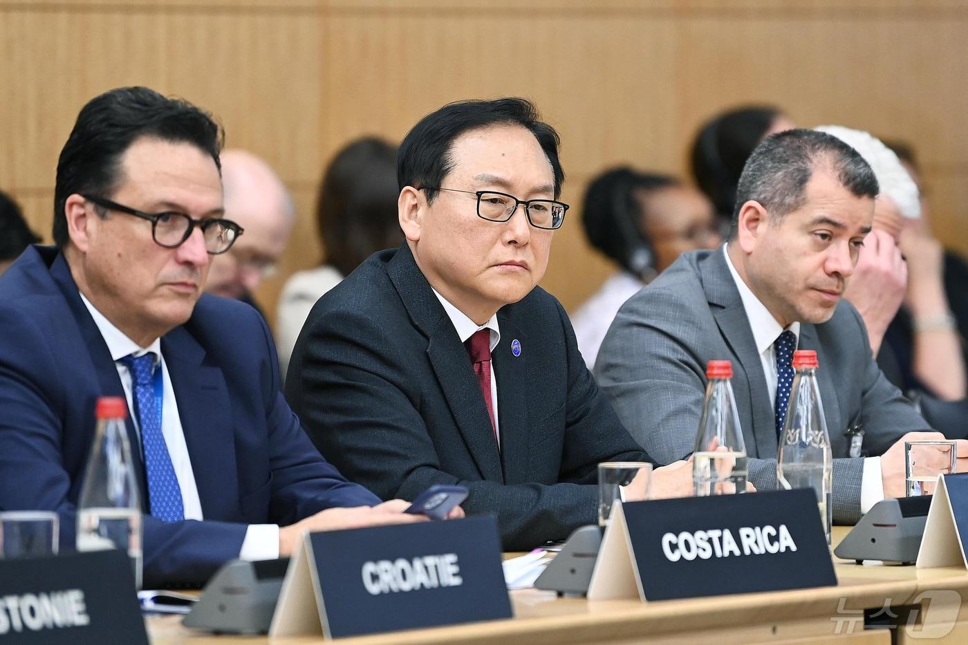정인교 산업통상자원부 통상교섭본부장이 3일(현지시간) 프랑스 파리 OECD 회의장에서 미국, 캐나다 등 OECD 38개 회원국 통상장관들이 참석한 가운데 열린 'OECD 각료이사회 세션5'에 참석, 상호 연계된 글로벌 위기 속 지속가능 성장을 위한 신뢰 가능한 경로 등을 논의하고 있다. (산업통상자원부 제공) 2024.5.3/뉴스1