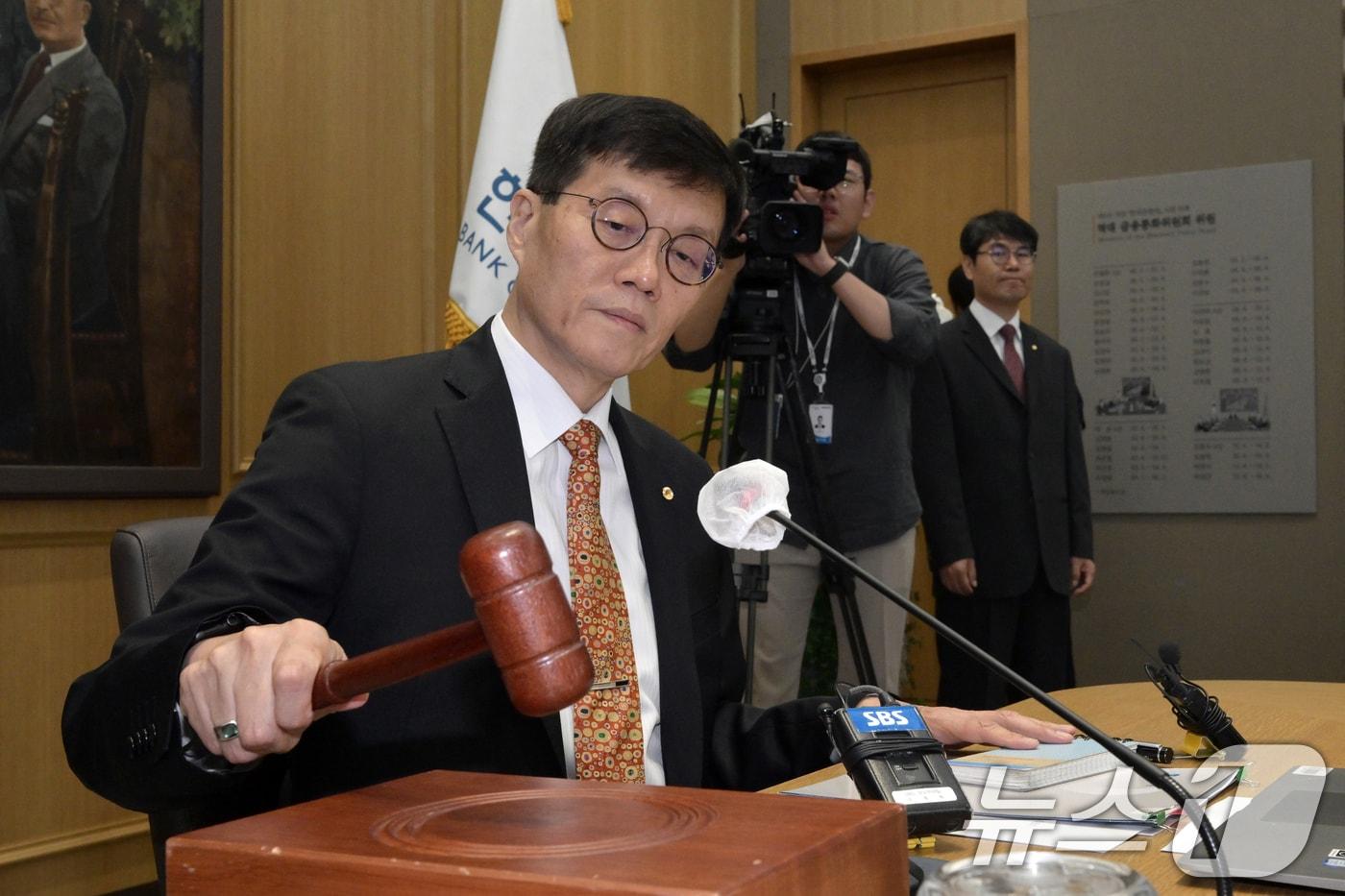 이창용 한국은행 총재가 23일 서울 중구 한국은행에서 열린 금융통화위원회에서 의사봉을 두드리고 있다. 2024.5.23/뉴스1 ⓒ News1 사진공동취재단관련 키워드물가인플레금리정책이자대출손승환 기자 국힘, 尹 체포방해 징역 5년에 "입장 없다…사법부 판단 존중"송언석 "제1야당 대표 단식…공천뇌물 특검 반드시 이뤄져야"관련 기사시카고 연은 총재 "여기가 짐바브웨냐"…파월 의장 수사 비난미니애폴리스 연은 총재 "올해 美 경제 낙관…인플레 둔화 속도 관건""트럼프가 연준 흔들면 70년대 대인플레 시대 온다"…전문가 경고'연준 2인자' 뉴욕 연은 총재 "현재 금리, 고용·물가 안정에 최적"FOMC 12월 의사록 "추가 금리인하 기대"…내부 분열 고조