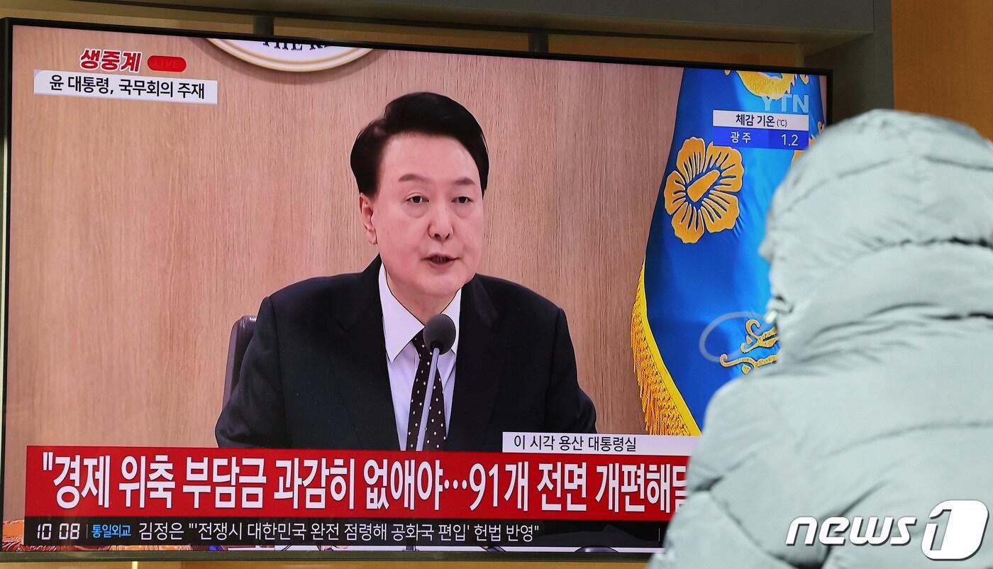 지난 4월 서울 중구 서울역 대합실을 찾은 시민들이 윤석열 대통령 주재 국무회의 영상을 시청하고 있다. 2024.1.16/뉴스1 ⓒ News1 장수영 기자