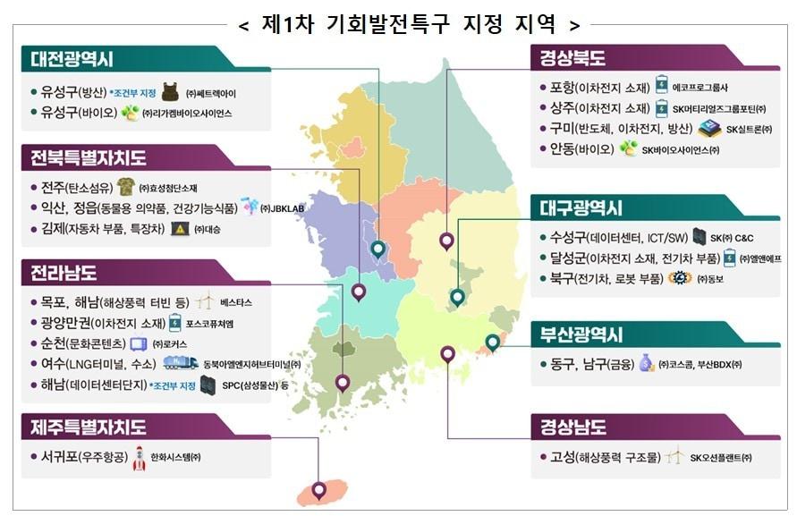 경북·전남·전북·대구·대전·경남·부산·제주에 新성장거점 지정기회발전특구 내 가업상속공제 확대 등 추가 인센티브도 마련기회발전특구.관련 키워드기회발전특구경북전남가업상속공제산업통상자원부나혜윤 기자 정부·화학업계, 2026년 구조개편 본격 추진…"산업 반전 원년 만들 것"중부발전, 오만 태양광·BESS 금융종결…중동 공략 본격화관련 기사AI·초혁신경제로 성장판 연다…李정부 '3% 잠재성장률' 도전(종합)산업부, 기회발전특구 '맞춤형 인력양성 프로그램' 가동…52억 투입