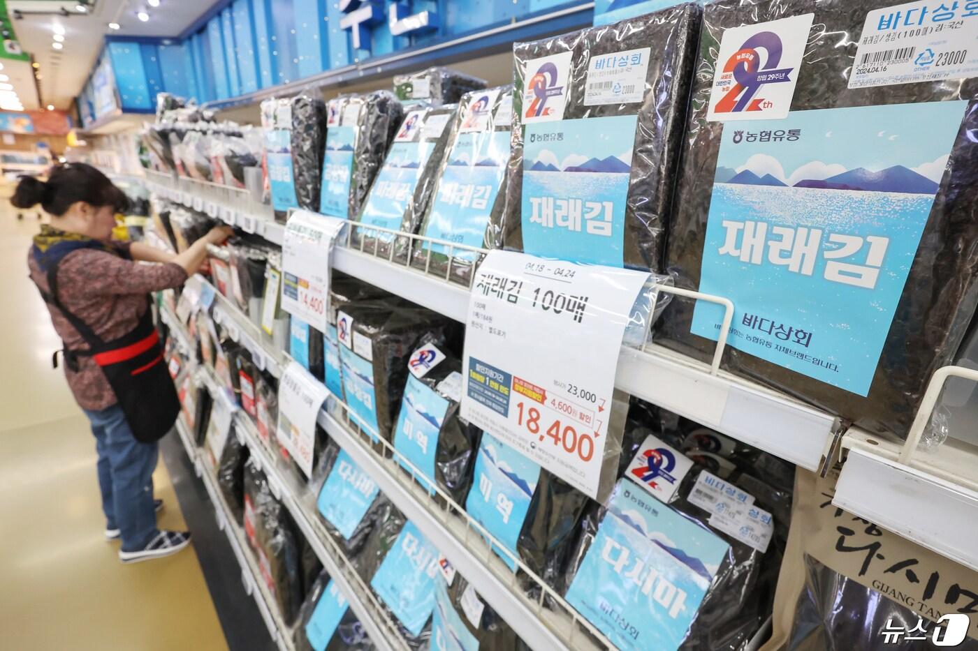 서울의 한 대형마트에서 직원이 김 매대를 정리하고 있다. 2024.4.23/뉴스1 ⓒ News1 민경석 기자