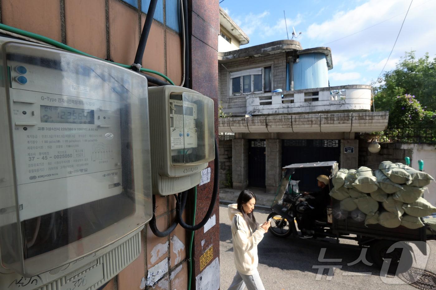 23일 오후 서울 동대문구 신당동의 주택가에 설치된 전력량계가 돌아가고 있다. 산업통상자원부와 한국전력공사는 서민경제 부담 등을 고려해 주택용과 일반용 전기요금은 동결하고, 산업용 고객에 한정해 내일부터 전력량 요금을 평균 한 자릿수 인상률인 9.7% 인상하기로 결정했다. 이에 따라 내일부터 산업용 전기요금을 kWh당 평균 16.1원 인상해 산업용(갑)의 평균 판매단가는 168.9원, 산업용(을)은 164.6원으로 오를 예정으로, 한전은 이번 조치로 월 3900억 원, 연간 4조 7000억 원가량의 추가 수익을 걷을 수 있을 것으로 추산된다. 2024.10.23/뉴스1 ⓒ News1 박정호 기자