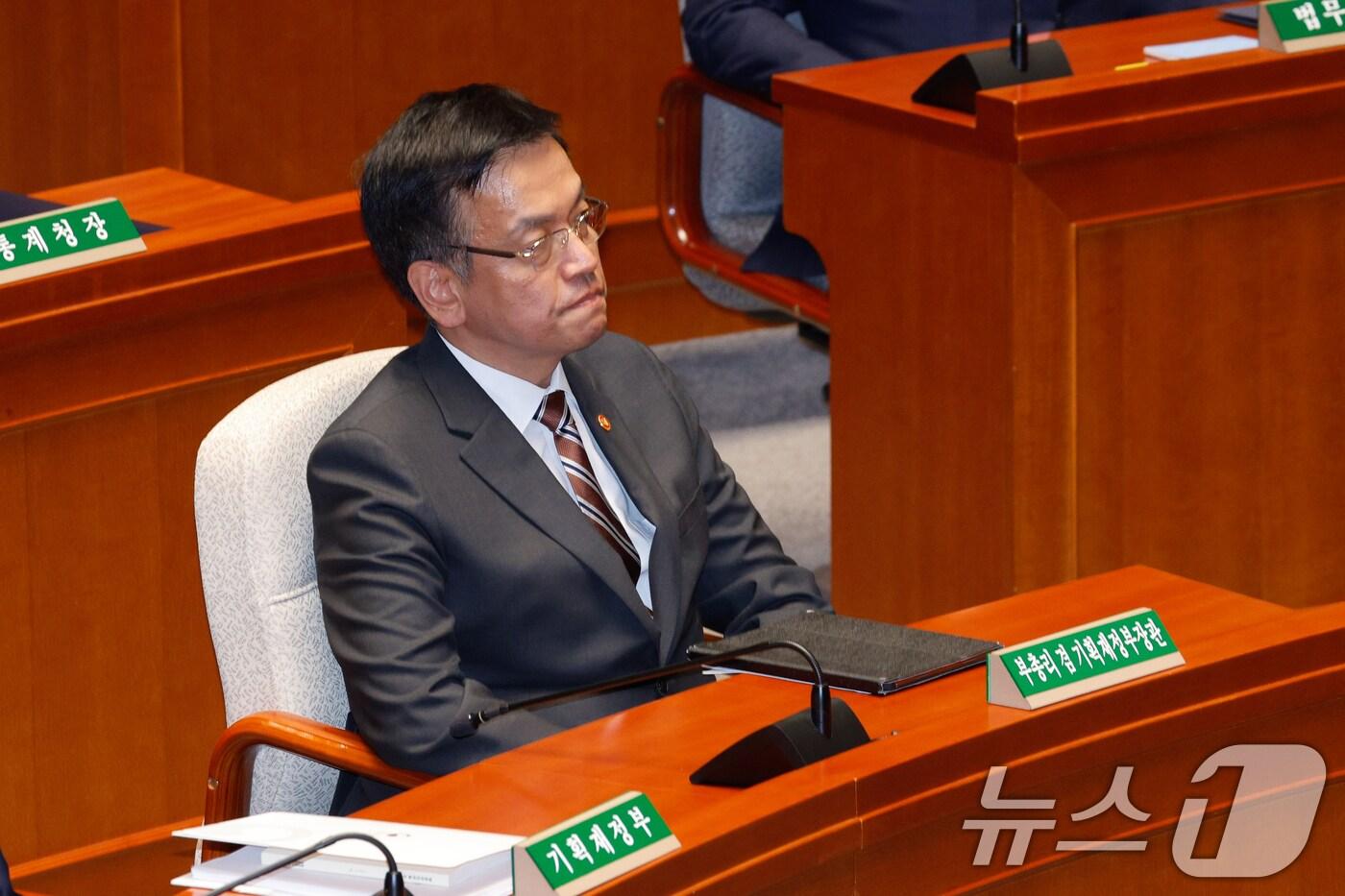 "野, 책임감 없이 민생 저버리는 예산안 일방처리""단독 처리 멈추고 합의 처리 임해달라…정부도 적극 협조"최상목 경제부총리 겸 기획재정부 장관이 29일 오후 서울 여의도 국회에서 열린 예산결산특별위원회 제13차 전체회의에서 국민의힘 의원들 퇴장 속에 정부 감액 예산안이 통과되자 인사말을 거부한채 자리에 앉아 있다. 2024.11.29/뉴스1 ⓒ News1 안은나 기자관련 키워드예산안단독 처리기획재정부기재부유감이철 기자 이창용 "환율·집값 리스크에 금리 동결"…인상론엔 선 그어(종합)[속보]이창용 "한미 MOU 투자액 조정 가능…외환 불안하면 200억불 못나간다"관련 기사[단독] 재경부·예산처 분리, 첫해 인건비·기본경비만 214억 늘어여야, 예산안 두 차례 회동 합의 불발…오후 5시 재협상예산 끊기고 해외투자도 지연…대왕고래, 2차 탐사시추 난항예결위 소위서 여당 단독으로 추경안 의결…전체회의 시작'30.5조' 이재명 정부 첫 추경안 심사 돌입…여야 격돌 불가피
