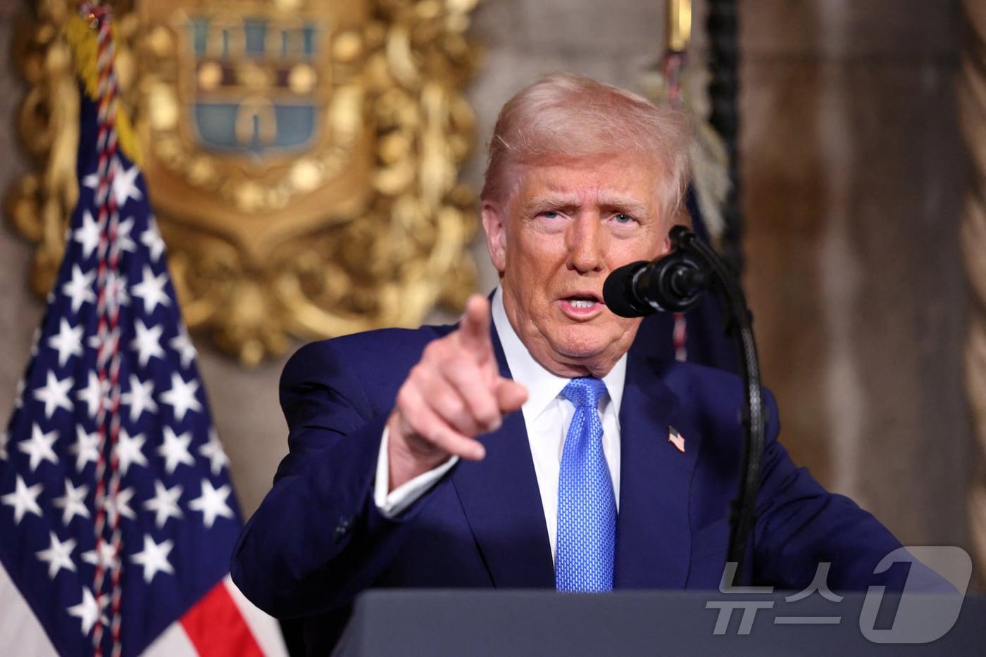 도널드 트럼프 미국 대통령이 2025년 2월 18일(현지시간) 미국 플로리다주 팜비치의 마라라고에서 연설하면서 가리키고 있다. 2025.02.18 ⓒ 로이터=뉴스1 ⓒ News1 김경민 기자