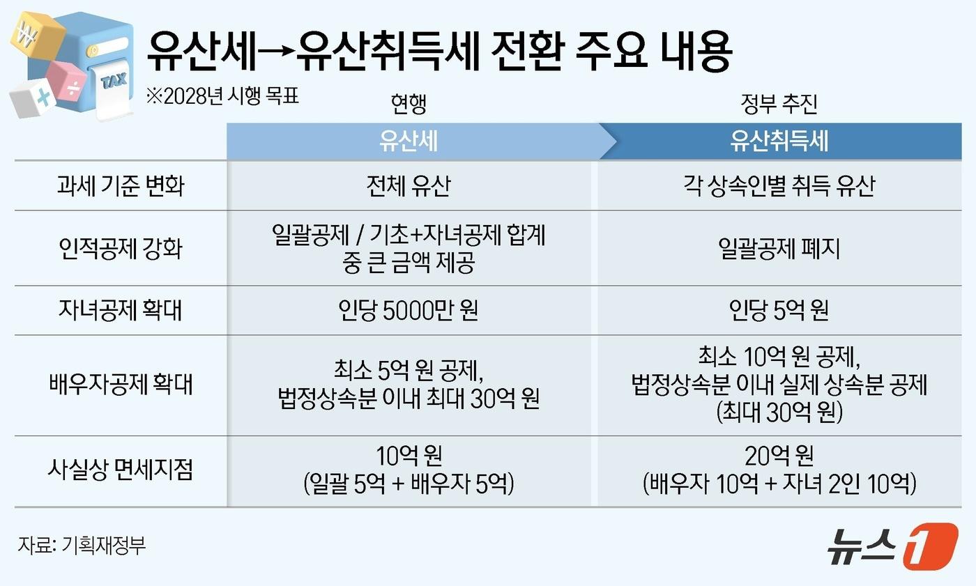 각자 받은 만큼만 상속세 내도록 개편…자녀당 5억, 배우자 10억까지 공제5월 중 국회 제출…2028년 최종 시행 계획ⓒ News1 양혜림 디자이너관련 키워드입법예고유산취득세유취세기재부상속세유산세세금