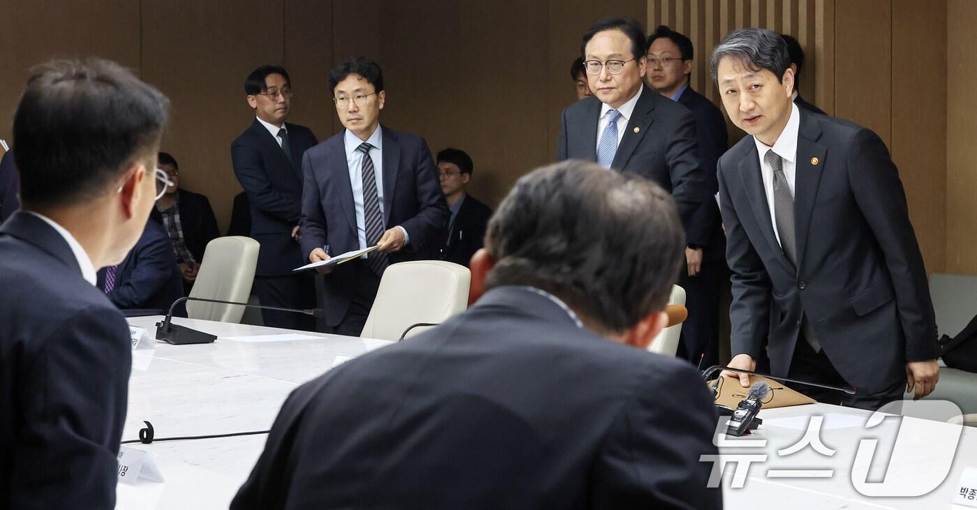 안덕근 산업통상자원부 장관이 27일 오후 서울 중구 대한상공회의소에서 열린 '자동차 관세 부과 민관 합동 긴급 대책회의'에서 참석자들과 인사를 나누고 있다. 이날 회의는 도널드 트럼프 미국 대통령이 오는 4월 3일부터 우리나라를 포함한 외국산 수입 자동차에 25%의 관세를 부과하겠다는 계획을 발표함에 따라 마련됐다. 2025.3.27/뉴스1 ⓒ News1 민경석 기자