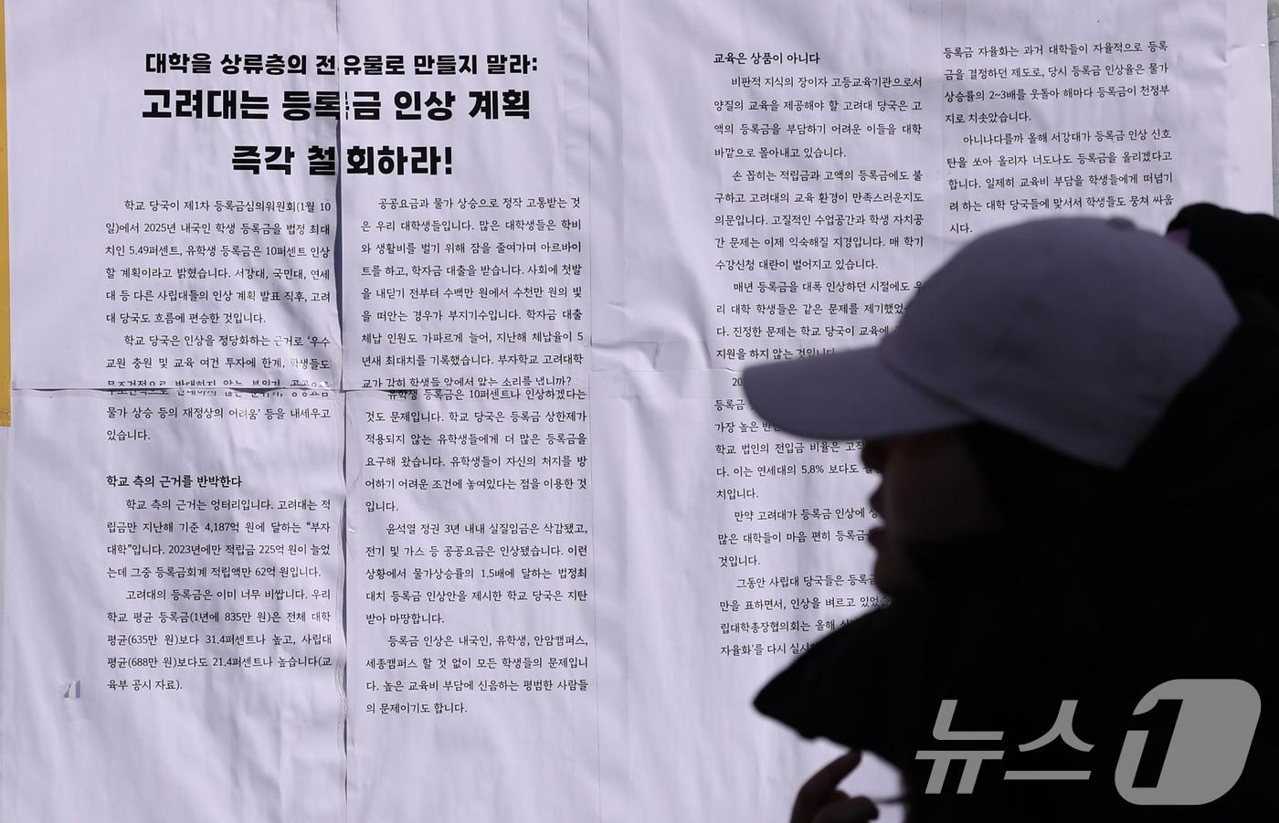 3월 교육물가 2.9% 상승…2009년 2월 이후 최대사립대 납입금 5.2%·유치원비 4.3%↑전국 대학교 4곳 중 1곳 꼴로 학부 등록금을 올린 것으로 나타난 2일 서울 성북구 고려대 안암캠퍼스에 등록금 인상계획 즉각 철회 대자보가 붙어 있다. 2025.2.2/뉴스1 ⓒ News1 박지혜 기자전민 기자 與, 이혜훈 '단독 청문회' 갈까…정태호 "野 임이자 위원장과 일단 협의"올해 공공기관 투자 70조 역대 최대…상반기 37조 집행