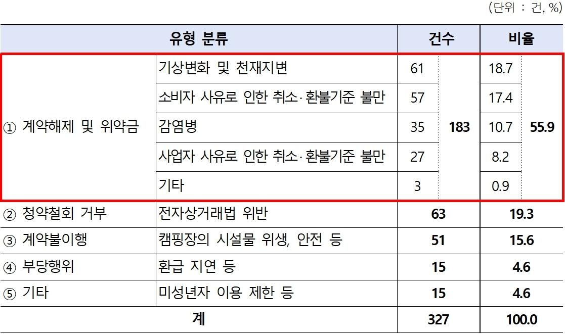 5년간 피해구제 327건…"날씨·규정 확인해야"캠핑장 관련 주요 피해유형 및 세부사유(한국소비자원 제공). 2025.6.17/뉴스1관련 키워드캠핑분쟁소비자원이철 기자 소비자위 "SKT, 해킹피해자에 10만원씩 보상"…2.3조 규모 전망대리점 5곳 중 1곳 "본사 불공정 행위 경험"…판매목표·구입 강제