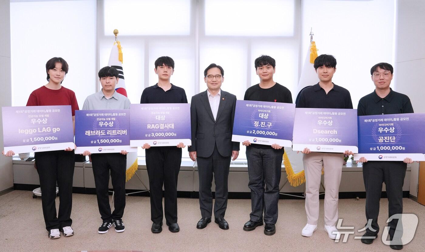 9일 정부세종청사에서 열린 '제1회 공정거래 데이터 활용 공모전' 시상식에서 한기정 공정거래위원장(왼쪽 네번째)과 수상자들이 기념 촬영을 하고 있다(공정위제공). 2025.7.9/뉴스1