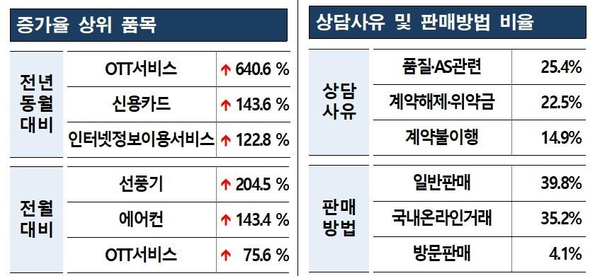 6월 OTT 서비스 상담 640% 급증…신용카드 스미싱 신고도무더위 앞두고 선풍기·에어컨 관련 상담도 늘어(한국소비자원 제공)관련 키워드소비자OTT쉐어JS선풍기에어컨소비자원소비자상담전민 기자 공정위원장 "쿠팡, 필요시 영업정지 처분도…집단소송제 검토 가능"(종합)구윤철 "내년 잠재성장률 반등 원년으로…민생경제 총력"