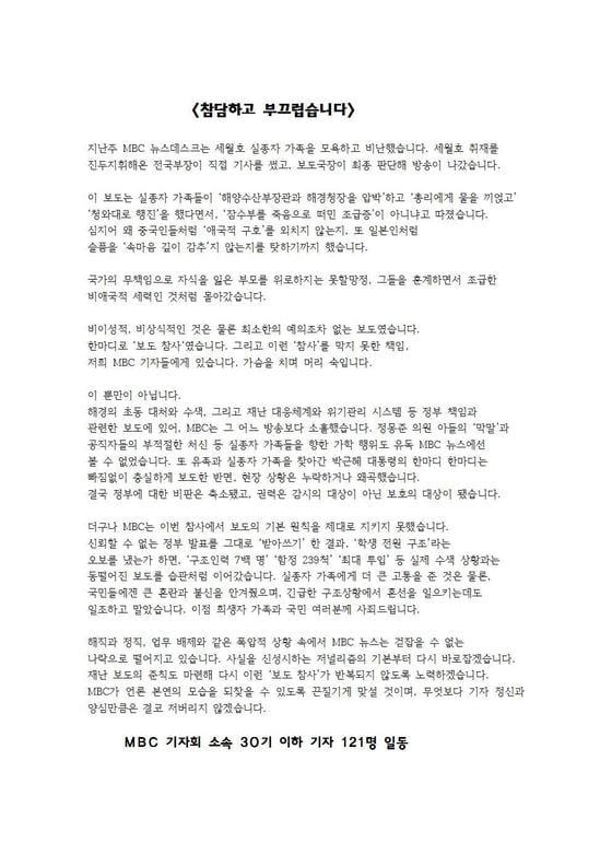 KBS에 이어 세월호 참사 보도 관련 자성 목소리(MBC 기자회 제공). © News1 주요 기사지상렬 16세 연하 쇼호스트 신보람 열애, 방송용 아닌 진짜였다'이혼 후 3년' 강성연, 열애 깜짝 고백 "아이들 아껴주는 사람"다니엘, 뉴진스 퇴출 15일만에 밝힌 첫 심경…431억 소송전엔 침묵 [N이슈]최강록 상대는 누구…'흑백2' 스포 논란 속 대망의 결승전 디데이'배성재♥' 김다영, 단아한 한복 탈의하니 울퉁불퉁 등근육…반전