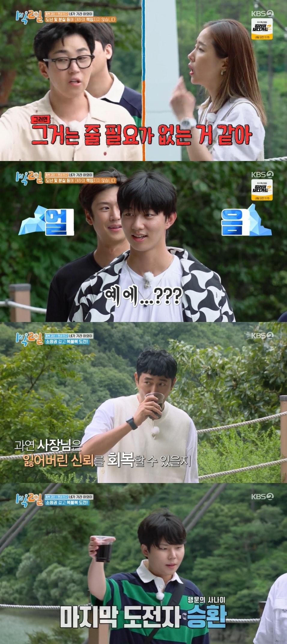 '1박 2일' 11일 방송KBS 2TV '1박 2일' 방송 화면 캡처주요 기사류시원 19세 연하 아내 공개…연예인급 미모 대치동 일타강사'흑백요리사2' 최강록 "조림 잘하는 척했다"…재도전 끝 우승'신세계家' 애니, 美 명문 컬럼비아대 복학…"학업·음악 작업 병행"박나래 전 매니저, 진실 공방 속 돌연 미국行…"건강상 이유"블랙핑크 리사, 파격 시스루…속 훤히 비치는 과감 패션