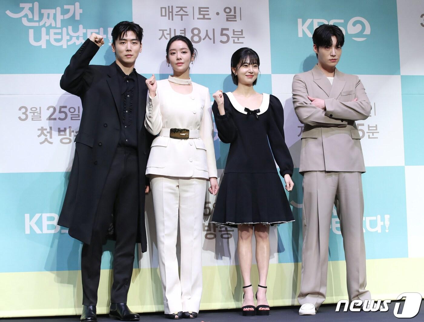 배우 정의제(왼쪽부터)와 차주영, 백진희, 안재현이 22일 오후 서울 구로구 신도림 라마다 호텔에서 진행된 KBS2 새 주말드라마 '진짜가 나타났다!'(연출 한준서/극본 조정주) 제작발표회에서 포즈를 취하고 있다. '진짜가 나타났다!'는 배 속 아기 '진짜'를 둘러싼 미혼모와 비혼남의 가짜 계약 로맨스 이야기로 임신·출산·육아를 통해 '애벤져스'로 거듭나는 이들 가족의 좌충우돌 성장기를 담은 휴머니즘 가족 드라마다. 2023.3.22/뉴스1 ⓒ News1 권현진 기자