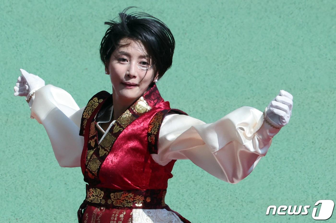 미스코리아 출신 한성주 전 아나운서가 9일 오전 경기도 고양종합운동장에서 열린 '2023 정기 고려대학교·연세대학교 친선경기대회' 럭비 경기에서 고려대학교 입학 30주년 93학번 응원부 '포효 93' 일원으로 단상에 올라 열정적인 응원전을 이끌고 있다. 2023.9.9/뉴스1 ⓒ News1 박정호 기자