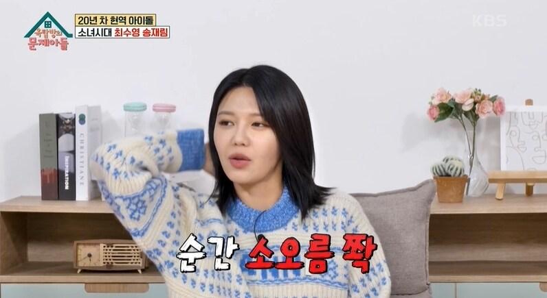 KBS2 '옥탑방의 문제아들' 방송 화면 갈무리KBS2 '옥탑방의 문제아들' 방송 화면 갈무리관련 키워드소녀시대수영중고거래옥탑방김학진 기자 주요 기사조정석♥︎거미, 14일 둘째 득녀…"산모와 아이 모두 건강"류시원 19세 연하 아내 공개…연예인급 미모 대치동 일타강사'신세계家' 애니, 美 명문 컬럼비아대 복학…"학업·음악 작업 병행"정우성 '메이드인코리아' 연기 칭찬글 바이럴 의혹에 소속사 반응은63세 윤영미, 속옷 없이 등 훤히 트인 과감 패션…"서비스"