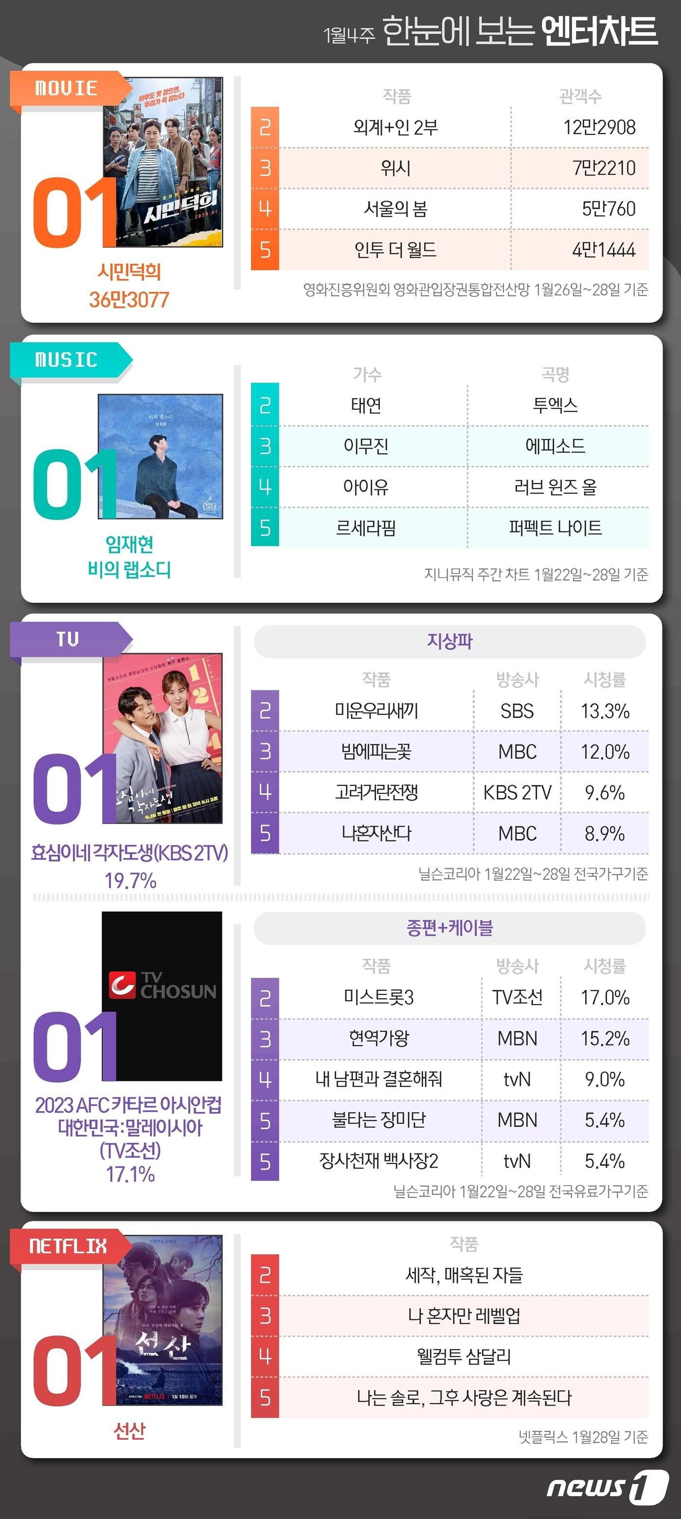 2024년 1월 넷째 주ⓒ News1 윤주희 디자이너관련 키워드한눈에보는엔터차트황미현 기자 [기자의 눈] 세계관 피로감 이후...K팝은 왜 다시 '캐릭터'를 꺼냈나NCT 드림, 3월 피날레 콘서트로 투어 대미…깊어진 역량주요 기사'텐트생활' 박군, 한영과 결혼 4년만에 이혼설 입 열었다"성관계했지만 강제성 NO"…日 기획사 대표, 소속배우 성폭행 혐의 체포숀 펜, 38세 연하 모델 여친과 손잡고 데이트…애정전선 이상無오르가니스트 '나솔' 정숙, 서현 오케스트라 협연 특혜 논란에 일침51세 김정은, 여전히 우아한 미모…소유진도 "자꾸 더 예뻐져" 감탄