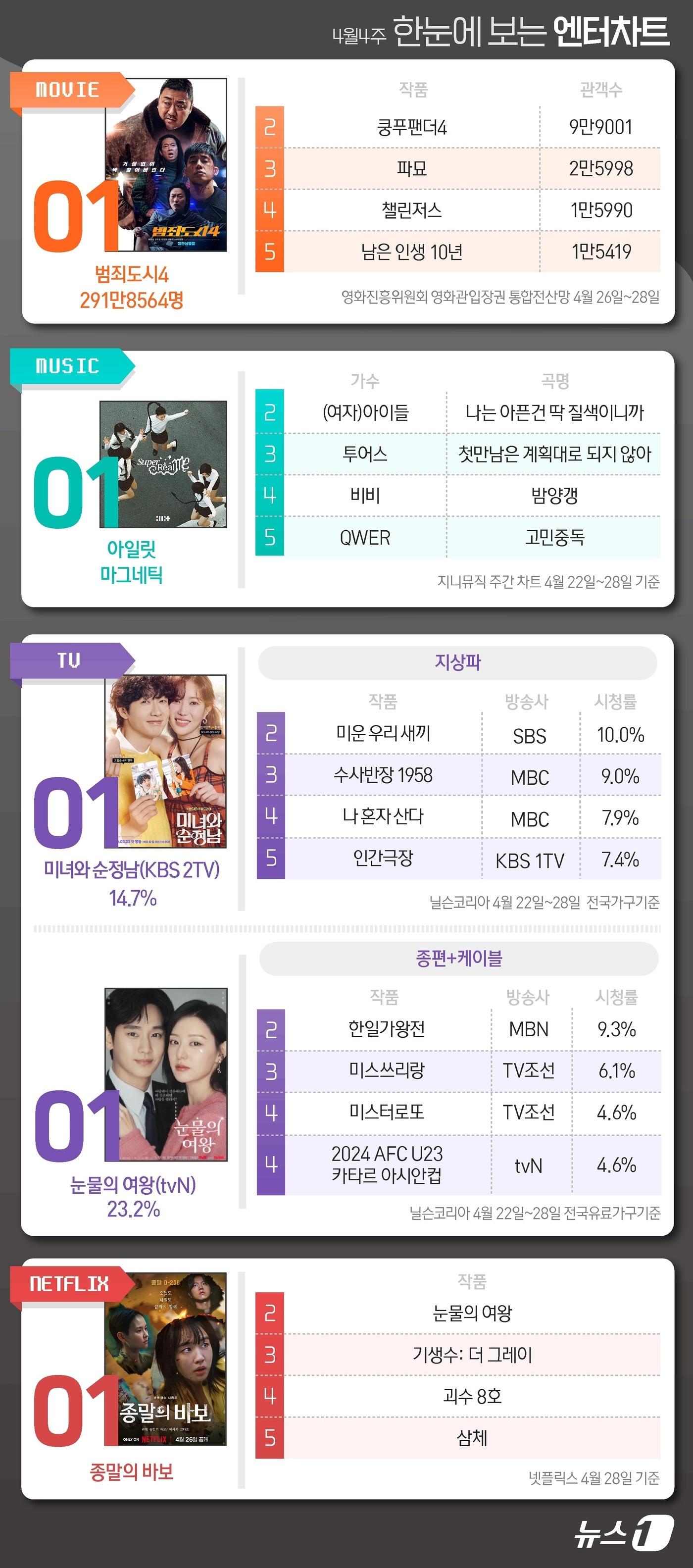 2024년 4월 넷째 주ⓒ News1 김지영 디자이너관련 키워드한눈에보는엔터차트김민지 기자 "기필코 우승할 것" '흑백2' 요리괴물, 후덕죽 꺾고 결승 진출김광진, 2월 21일 서울 앙코르 공연 개최…열기 잇는다주요 기사지상렬 16세 연하 쇼호스트 신보람 열애, 방송용 아닌 진짜였다'이혼 후 3년' 강성연, 열애 깜짝 고백 "아이들 아껴주는 사람"다니엘, 뉴진스 퇴출 15일만에 밝힌 첫 심경…431억 소송전엔 침묵 [N이슈]최강록 상대는 누구…'흑백2' 스포 논란 속 대망의 결승전 디데이'배성재♥' 김다영, 단아한 한복 탈의하니 울퉁불퉁 등근육…반전