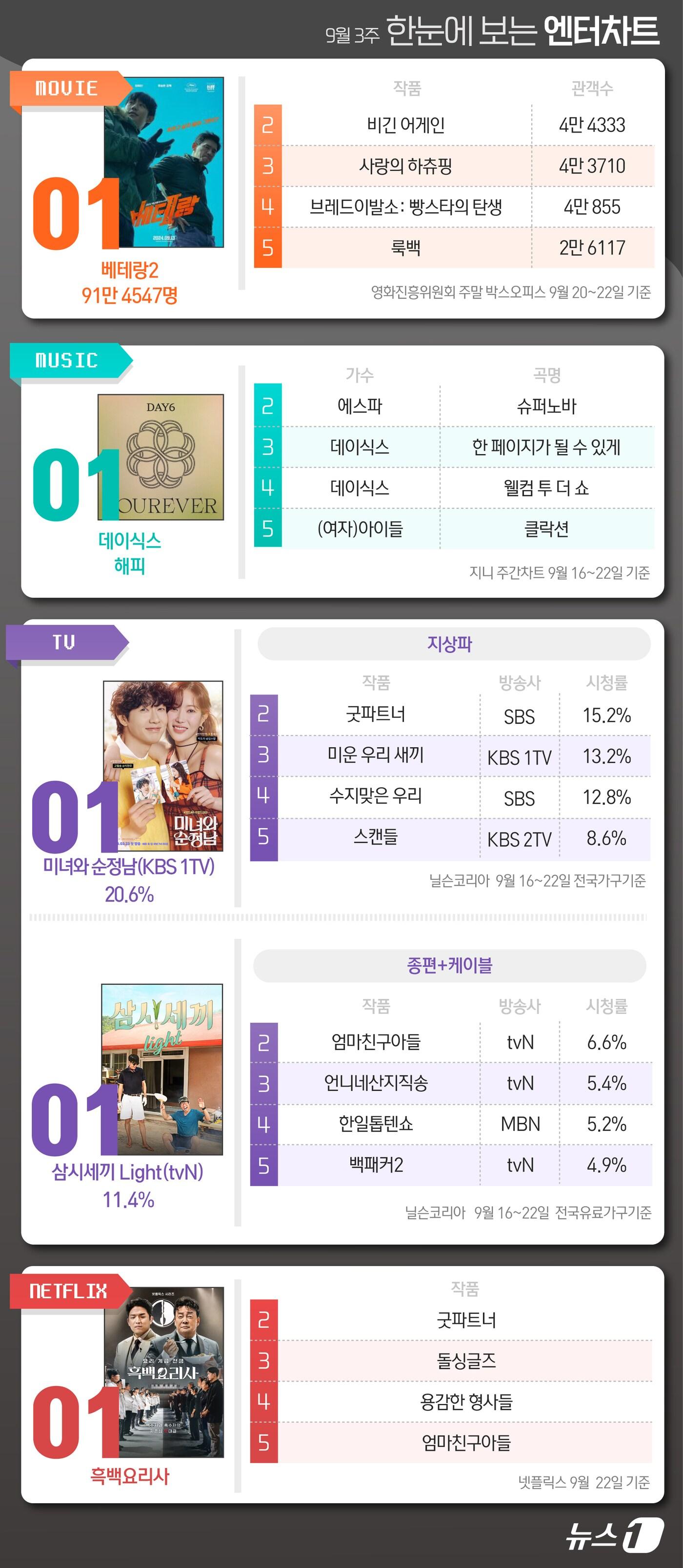 2024년 9월 셋째 주ⓒ News1 김초희 디자이너관련 키워드한눈에보는엔터차트베테랑2데이식스순정남삼시세끼굿파트너고승아 기자 박은영, 둘째 출산 소감 "노산임에도 자연분만으로 순풍"화사 '굿 굿바이'로 음원 올킬 656회 기록…국내 최다주요 기사지상렬 16세 연하 쇼호스트 신보람 열애, 방송용 아닌 진짜였다'이혼 후 3년' 강성연, 열애 깜짝 고백 "아이들 아껴주는 사람"다니엘, 뉴진스 퇴출 15일만에 밝힌 첫 심경…431억 소송전엔 침묵 [N이슈]최강록 상대는 누구…'흑백2' 스포 논란 속 대망의 결승전 디데이'배성재♥' 김다영, 단아한 한복 탈의하니 울퉁불퉁 등근육…반전