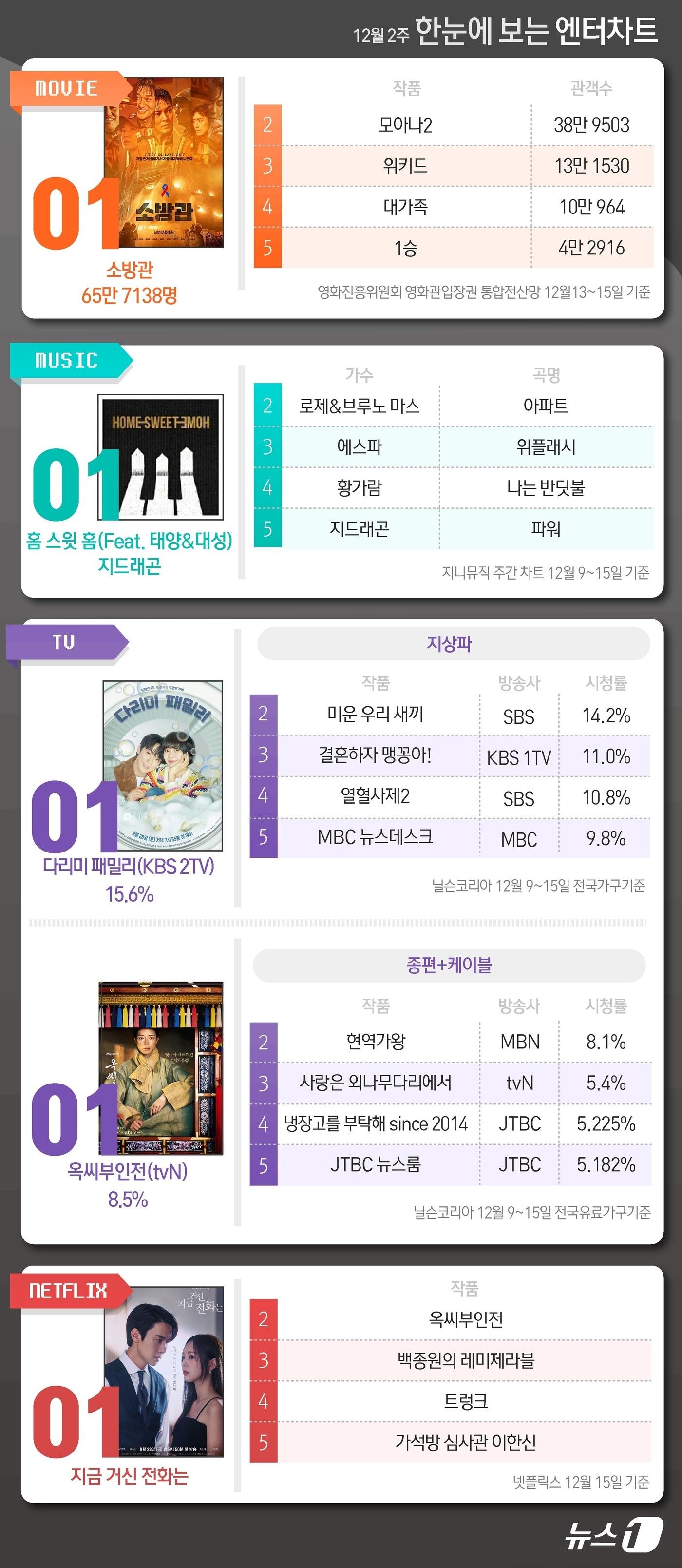 2024년 12월 둘째 주ⓒ News1 김초희 디자이너관련 키워드한눈에보는엔터차트김민지 기자 "기필코 우승할 것" '흑백2' 요리괴물, 후덕죽 꺾고 결승 진출…최강록과 대결김광진, 2월 21일 서울 앙코르 공연 개최…열기 잇는다주요 기사지상렬 16세 연하 쇼호스트 신보람 열애, 방송용 아닌 진짜였다'이혼 후 3년' 강성연, 열애 깜짝 고백 "아이들 아껴주는 사람"다니엘, 뉴진스 퇴출 15일만에 밝힌 첫 심경…431억 소송전엔 침묵 [N이슈]최강록 상대는 누구…'흑백2' 스포 논란 속 대망의 결승전 디데이'배성재♥' 김다영, 단아한 한복 탈의하니 울퉁불퉁 등근육…반전